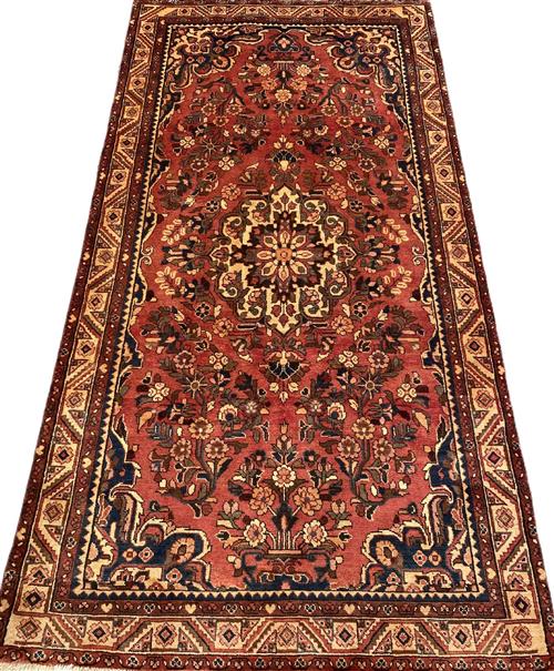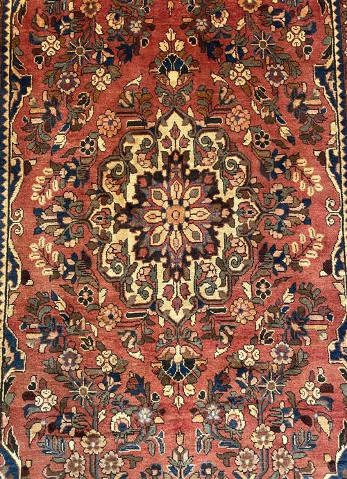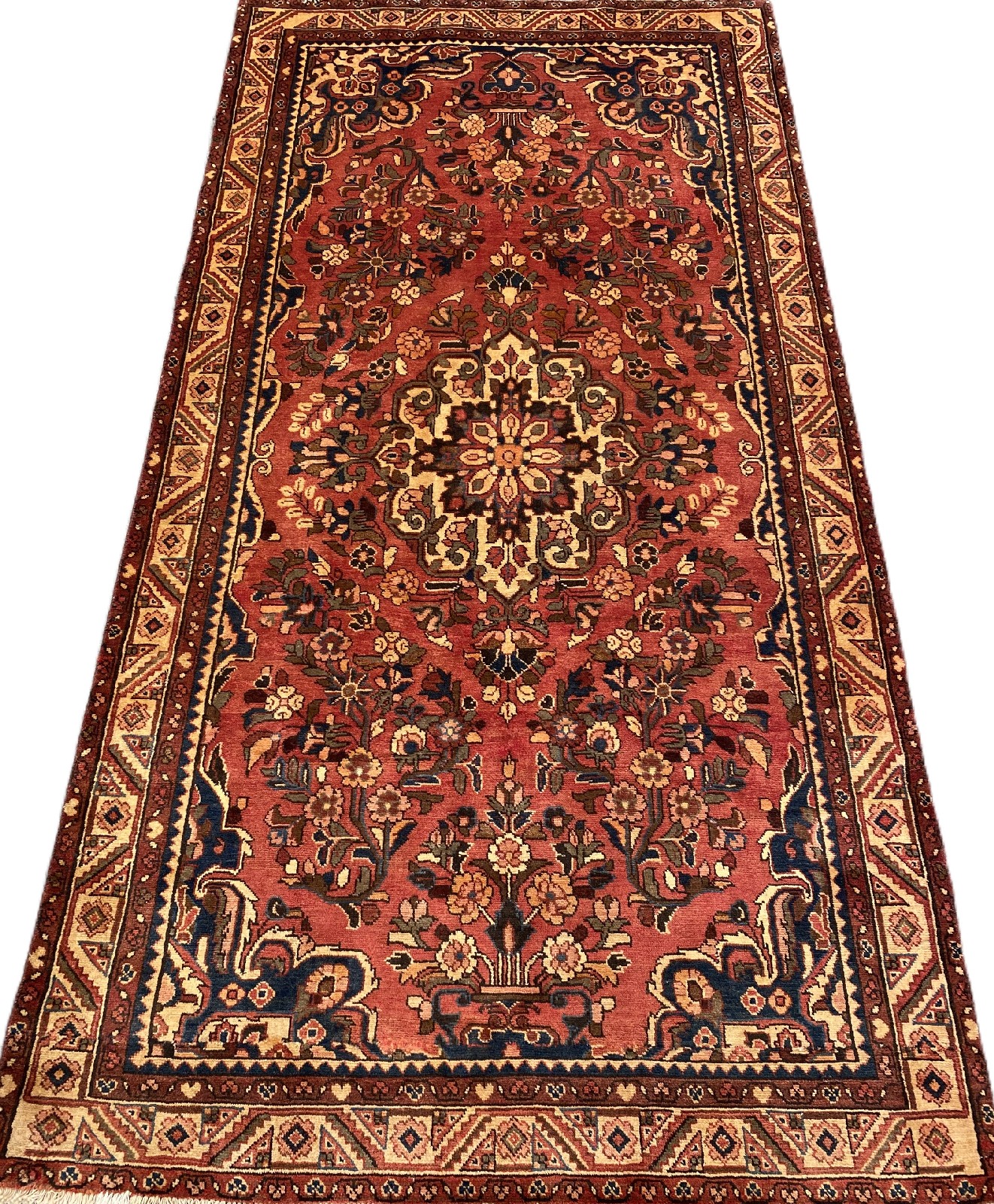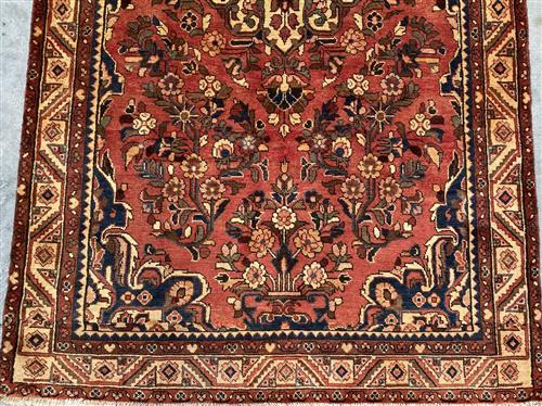 A PERSIAN LILLIAN WOOL RUG. WOVEN BY ARMENIANS IN IRAN. VILLAGE WEAVE WITH DISTINCT DESIGN OF A FLORAL MEDALLION AND QUARTERED CORNER MEDALLIONS, IN A RUSTY RED FIELD OF SYMMETRICAL URNS BEARING FLORAL FOLIAGE & FLORAL SPRAYS. BORDER OF ROSETTES AND LEAF FORMS. GALLERY DISPLAYED RUG, IN EXCELLENT CONDITION. ORIGIN: IRAN (312 X 160 CM) (PLEASE NOTE THERE MAY BE SOME COLOUR VARIATION FROM PHOTOGRAPH)