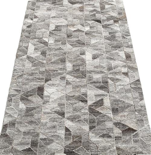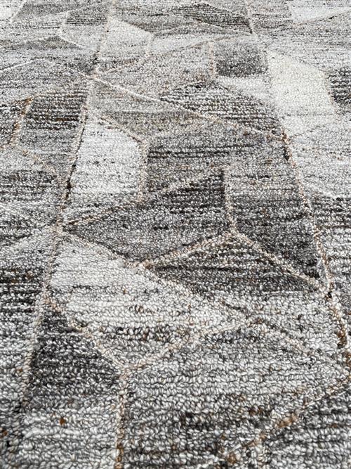 A NEW CONTEMPORARY MOSAIC DESIGN WOOLLEN RUG. HANDLOOM WEAVE. IN SHADES OF SILVER, CHARCOAL TAUPE. IN EXCELLENT CONDITION. ORIGIN: INDIA (274 X 183 CM) (PLEASE NOTE THERE MAY BE SOME COLOUR VARIATION FROM PHOTOGRAPH)