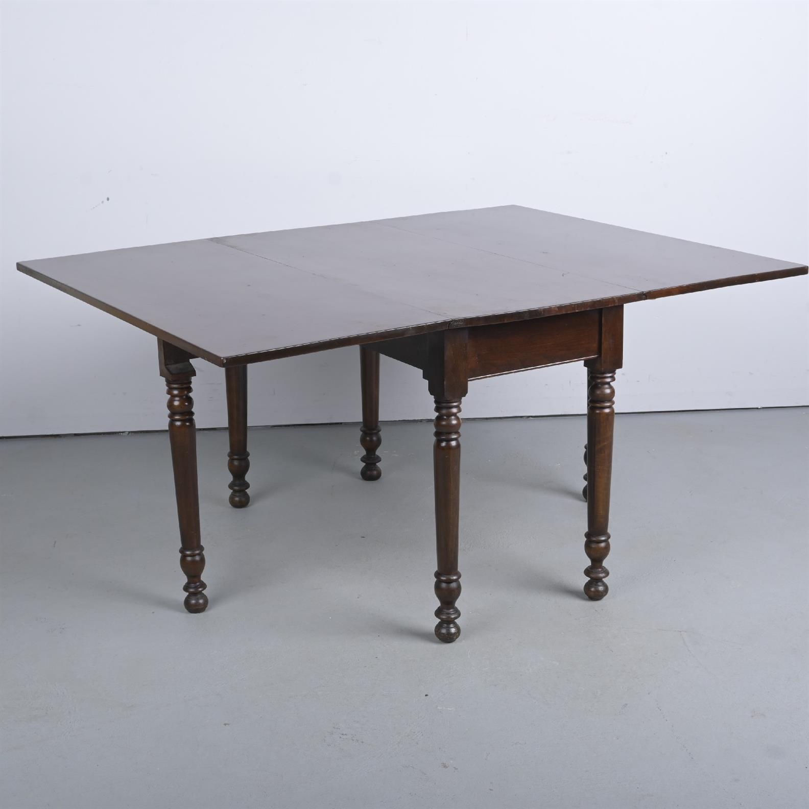 AN EARLY VICTORIAN-STYLE STAINED HARDWOOD DROP-LEAF DINING TABLE, ON TURNED LEGS (A/F) (H72 X W148 X D52 CM) (THIS ITEM MUST BE REMOVED BY CARRIERS AT THE CUSTOMER'S EXPENSE. LEONARD JOEL STAFF CANNOT ASSIST CARRYING THIS ITEM.)