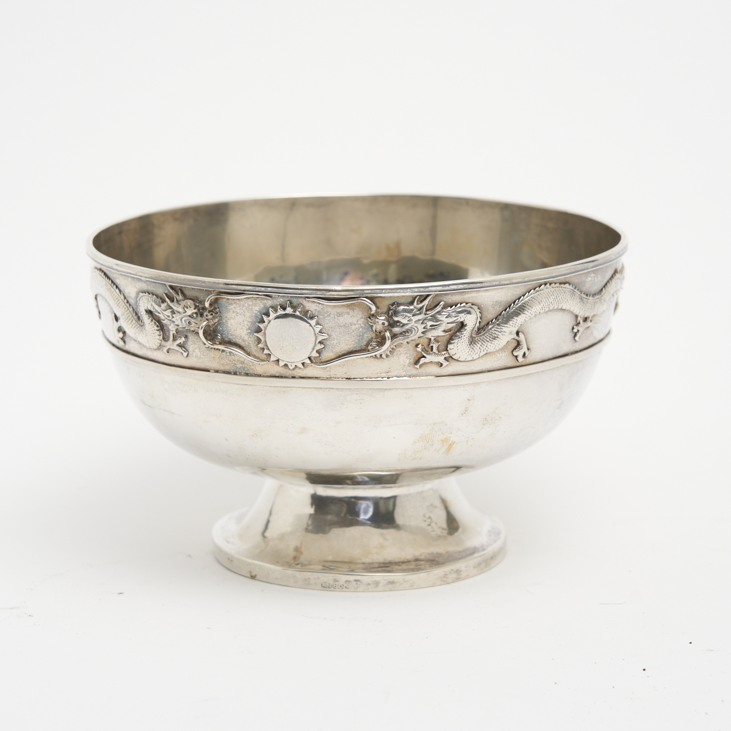 A CIRCA 1900 CHINESE SILVER DRAGON DECORATED FOOTED BOWL DIA.16.5CM 410G, LEONARD JOEL DELIVERY SIZE: MEDIUM
