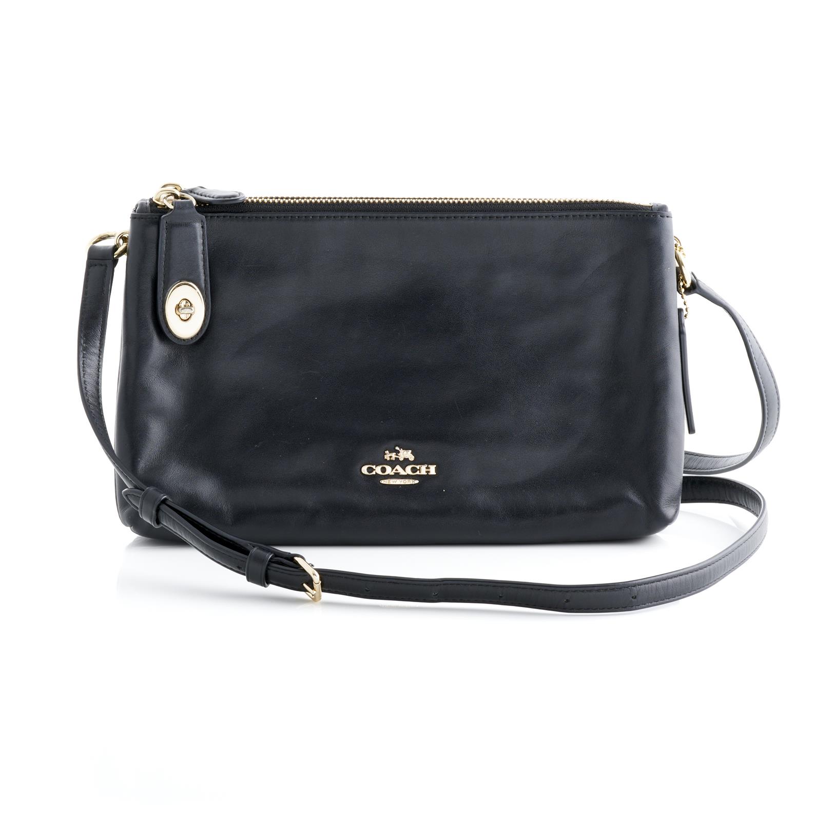 COACH, A CROSSBODY BAG STYLED IN BLACK LEATHER, FEATURING ADJUSTABLE STRAP AND GOLD TONE HARDWARE, 16 X 26 X 4CM
