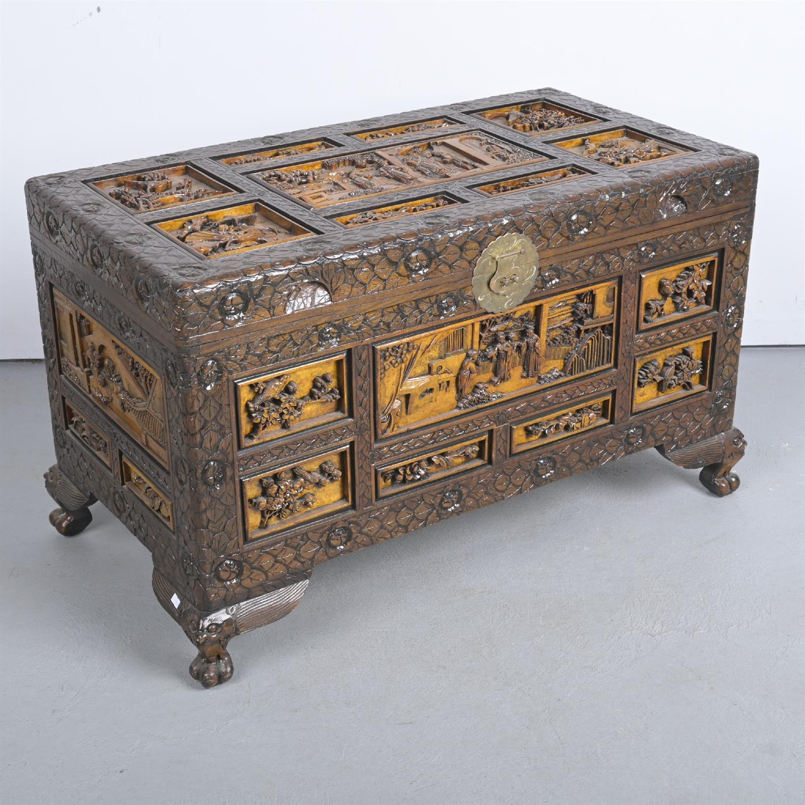 A CHINESE CARVED CAMPHOR WOOD CHEST (60H X 100W X 53D CM)