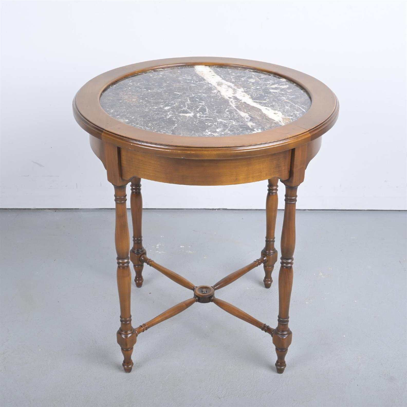 A FRENCH PROVINCIAL-STYLE CHERRY OCCASIONAL TABLE WITH INSET MARBLE TOP (75H X 70DIA CM)