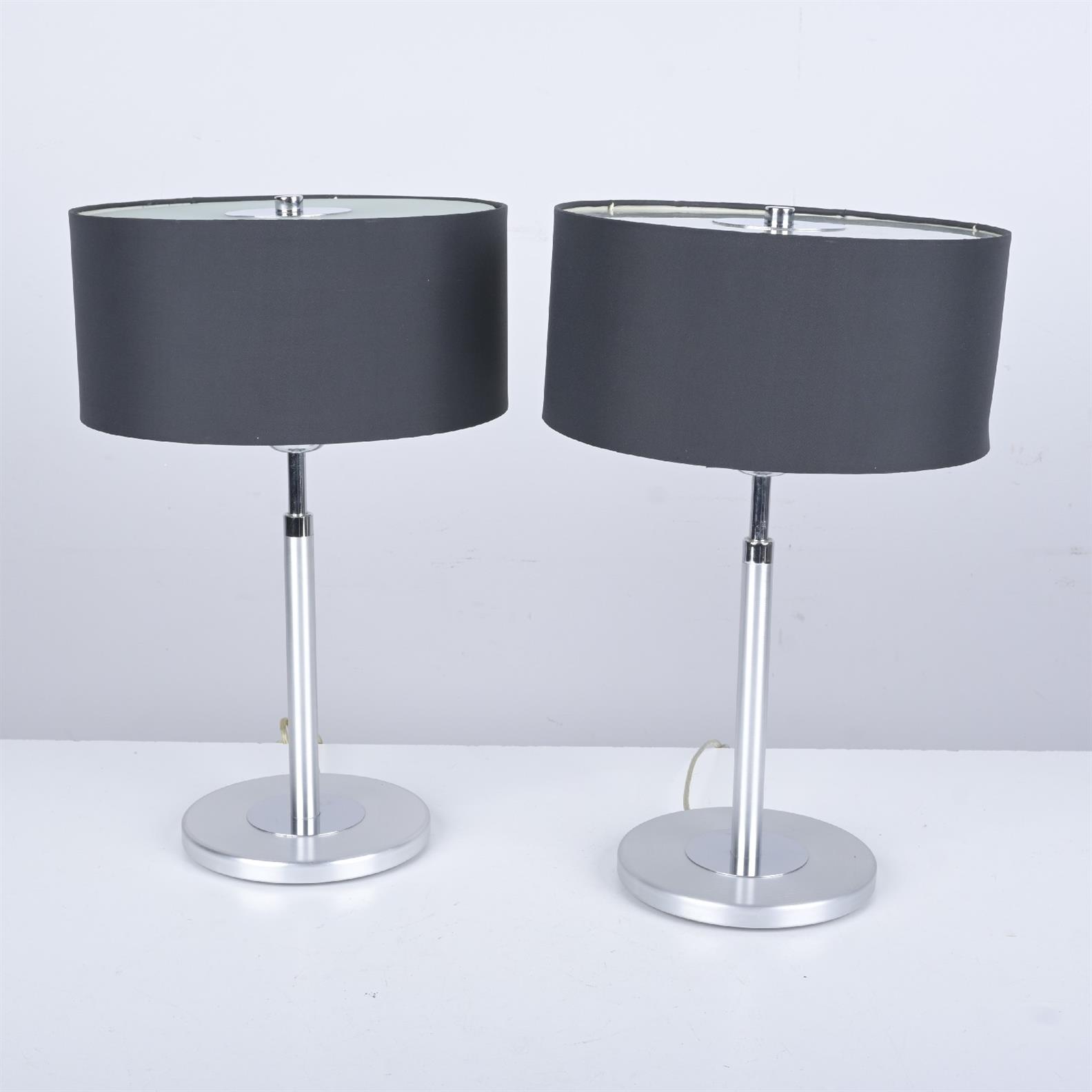 A PAIR 1980s CHROME AND ANODISED METAL BASED TABLE LAMPS WITH GLASS TOPS (46H X 28DIA CM)
