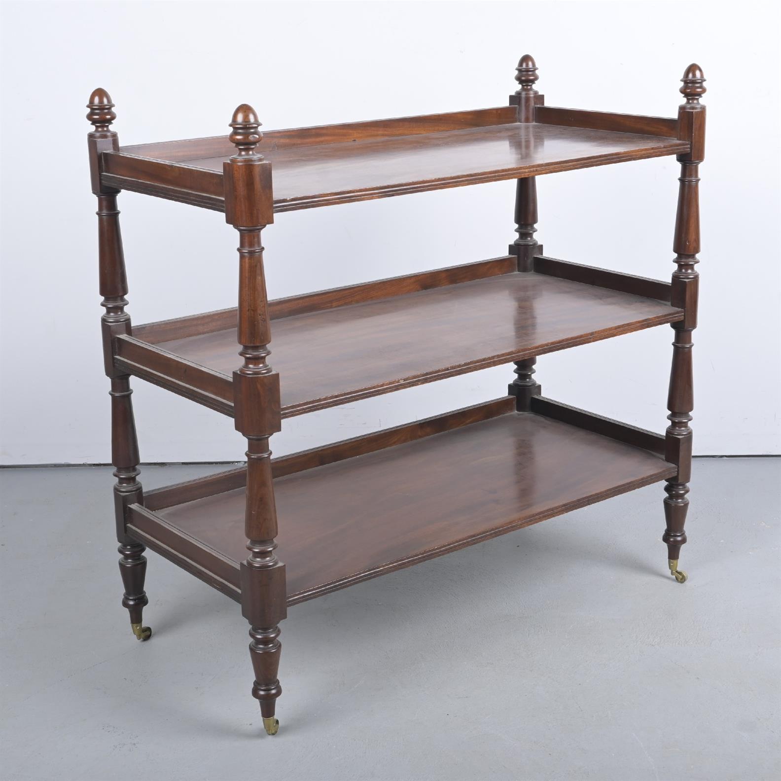 A VICTORIAN FIGURED MAHOGANY THREE TIER DUMBWAITER (107H X 107W X 53D CM) (THIS ITEM MUST BE REMOVED BY CARRIERS AT THE CUSTOMER'S EXPENSE. LEONARD JOEL STAFF CANNOT ASSIST CARRYING THIS ITEM.)