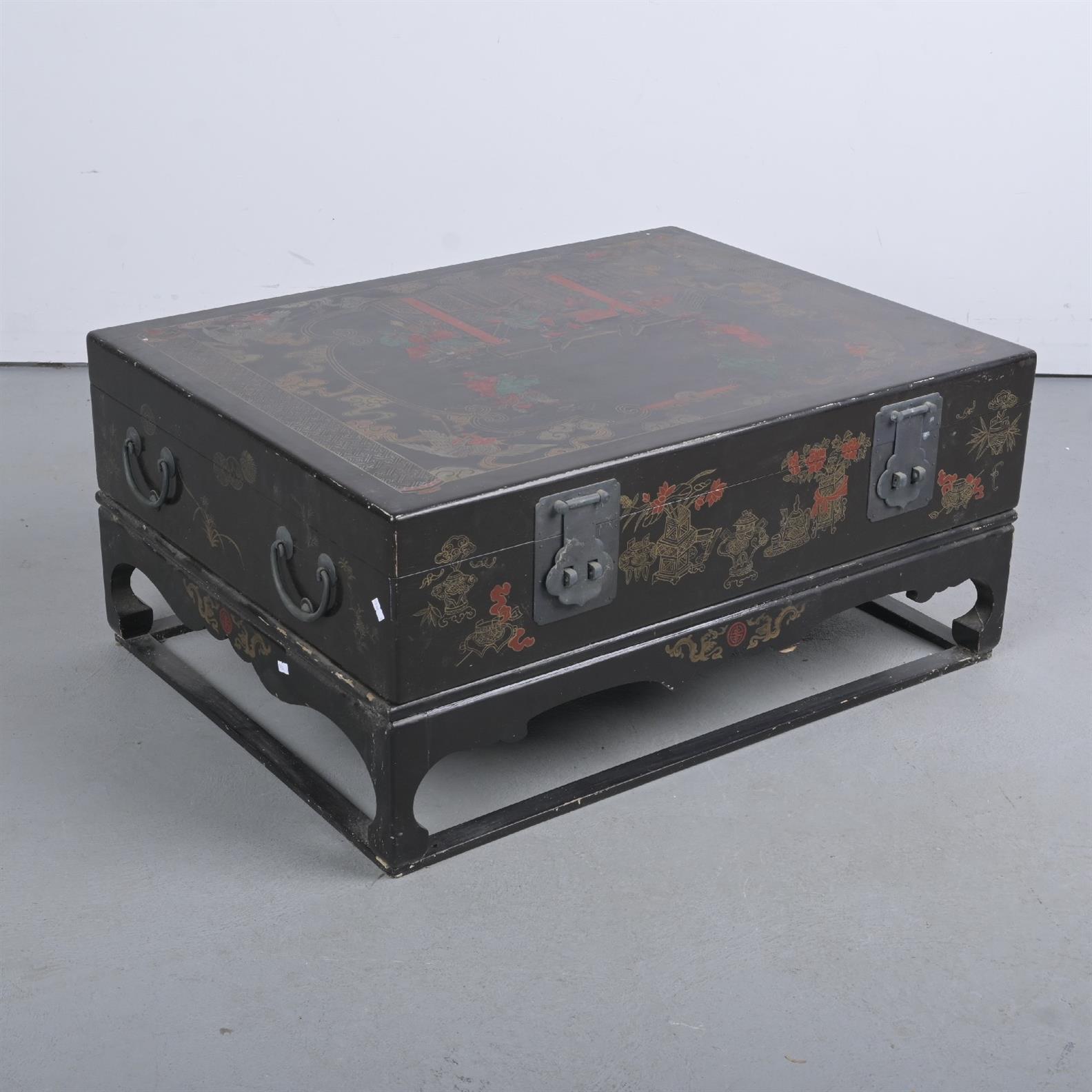 A LOW CHINESE BLACK LACQUERED CHEST (42H X 91W X 68D CM)