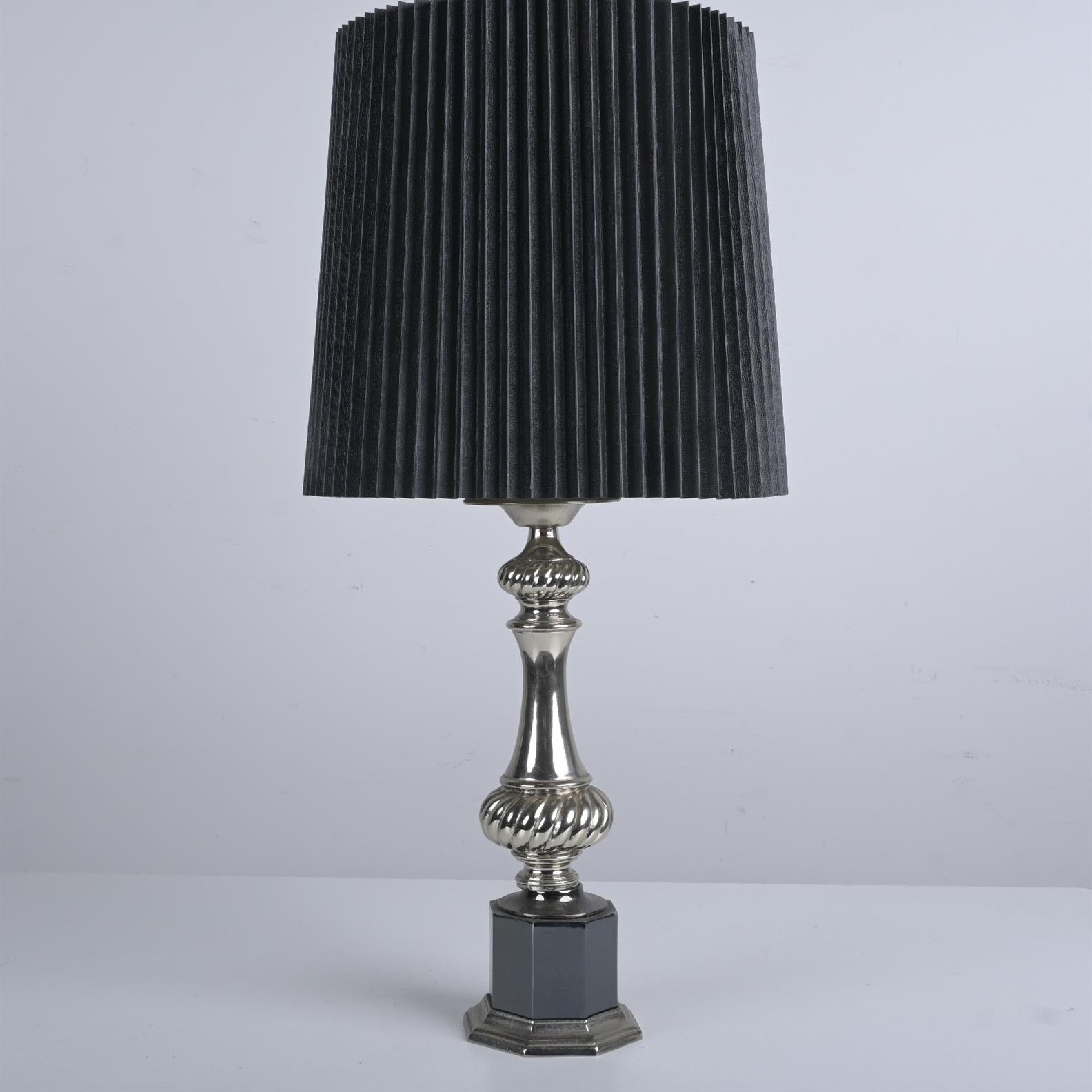 A BLACK AND SILVER TABLE LAMP WITH BLACK PAPER SHADE (78H X 37DIA CM)