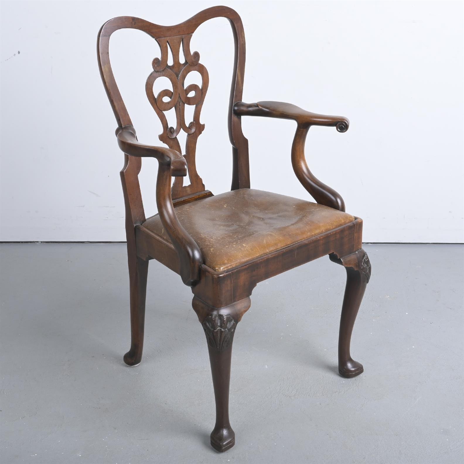 A SMALL PROPORTIONED GEORGIAN CHAIR WITH DROP IN LEATHER UPHOLSTERED SEAT (A/F) (96H X 55W X 43D CM)