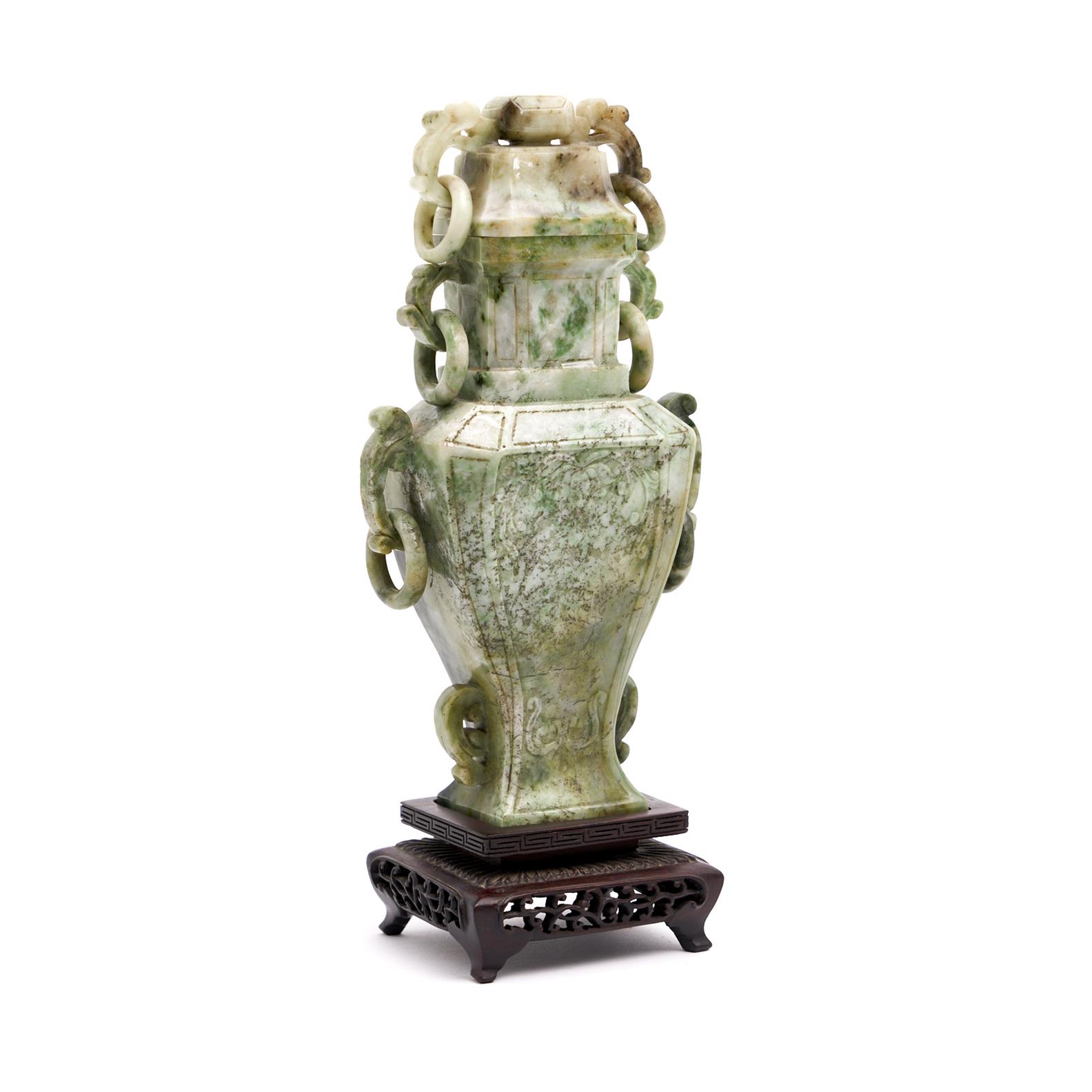 A SMALL CHINESE JADE URN AND COVER ON STAND H.26CM, LEONARD JOEL DELIVERY SIZE: MEDIUM