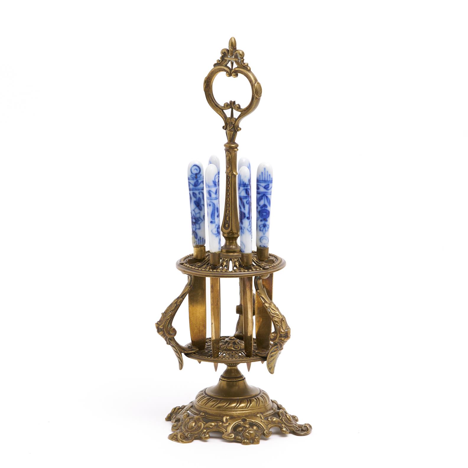 AN ANTIQUE FRENCH BRONZE FIGURAL BASED KNIFE STAND WITH MATCHED BRONZE BLADE KNIVES WITH BLUE AND WHITE MEISSEN PORCELAIN HANDLES H.31CM (STAND), LEONARD JOEL DELIVERY SIZE: MEDIUM
