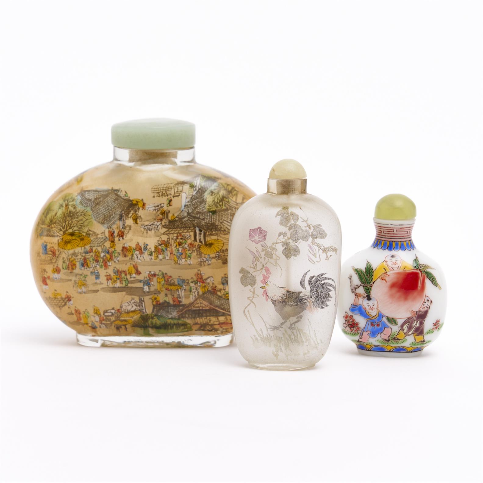 THREE SIGNED AND HANDPAINTED INSIDE REVERSE PAINTED GLASS AND JADE SNUFF BOTTLES W.10CM (LARGEST), LEONARD JOEL DELIVERY SIZE: SMALL