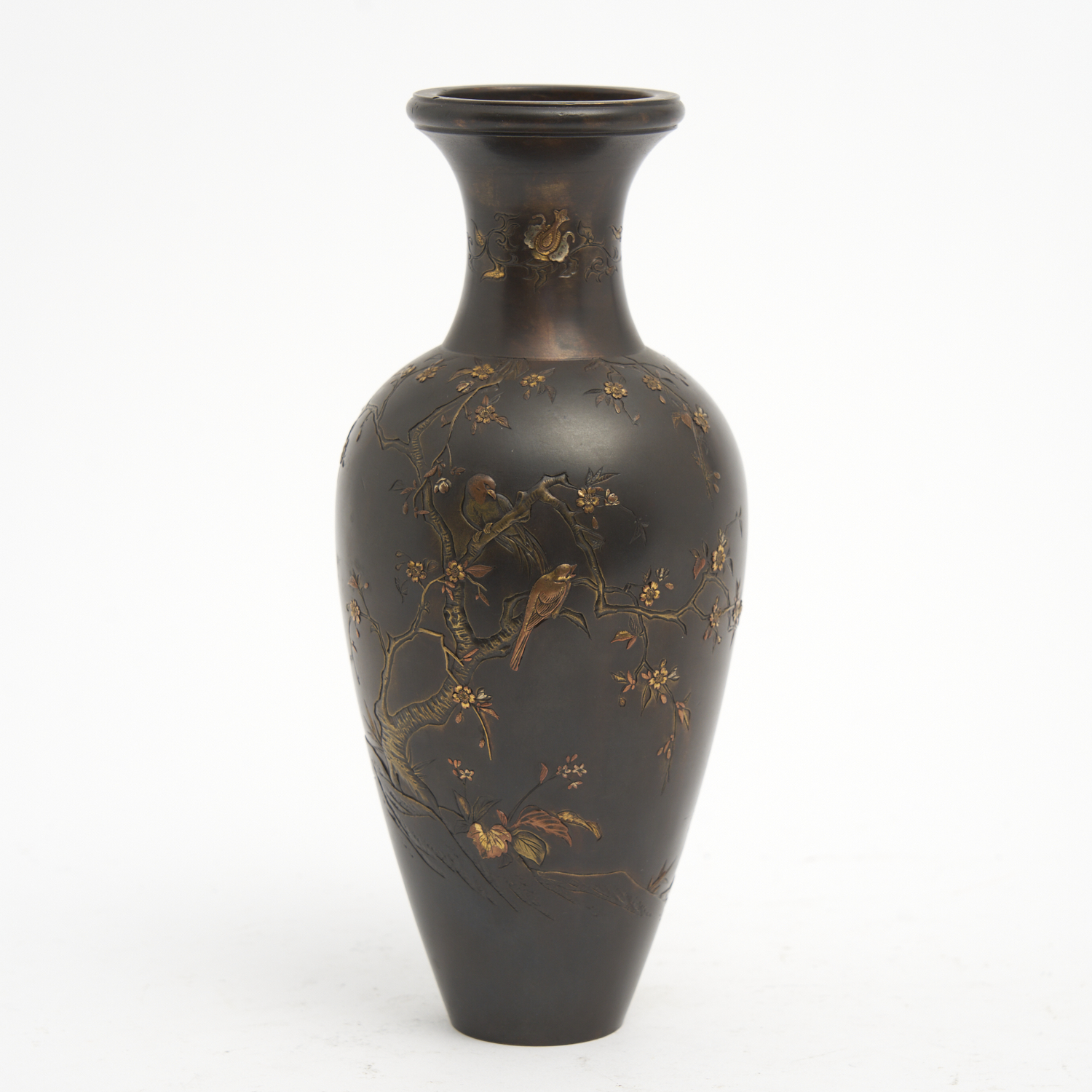 A JAPANESE MEIJI PERIOD SHAKUDO AND MIXED METAL INLAID BRONZE VASE DECORATED WITH RAISED FLOWERS AND BIRDS AMID FOLIAGE H.24CM H.24CM