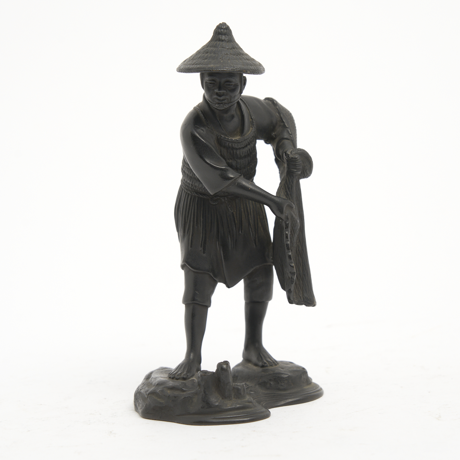 A JAPANESE BRONZE OF A FISHERMAN CASTING HIS NET H.18CM