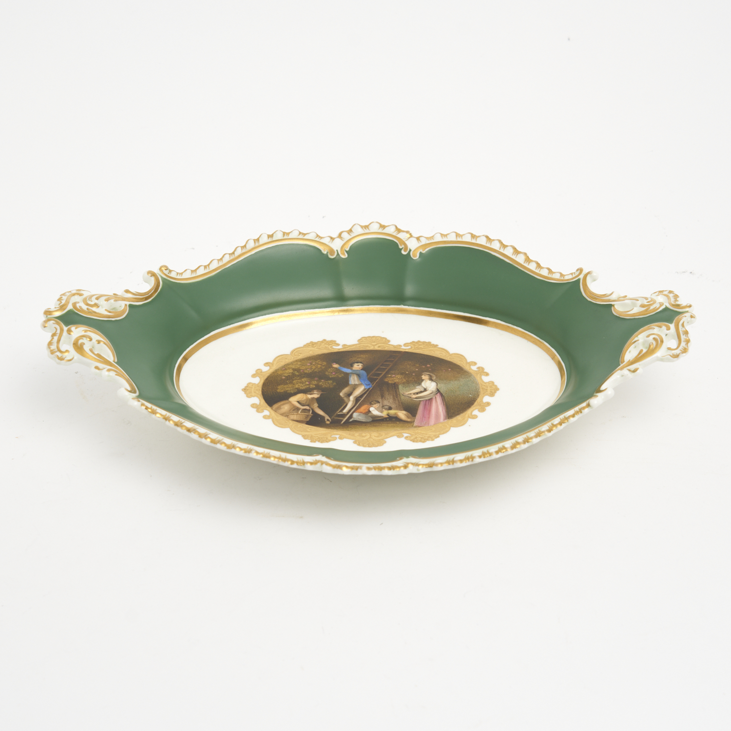 A CHAMBERLAIN'S WORCESTER GREEN GROUND OVOID DISH WITH PAINTED CENTRAL SCENE L.33CM