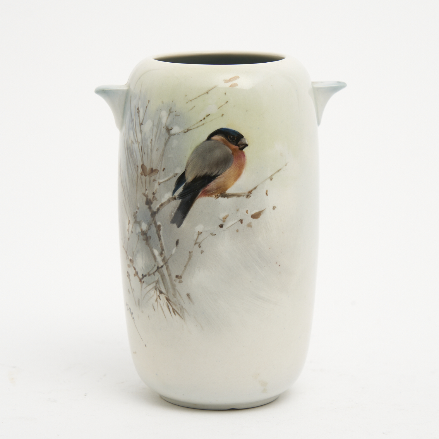 A ROYAL DOULTON TITANIAN VASE DEPICTING A BULLFINCH BY HARRY ALLAN H.14.5CM