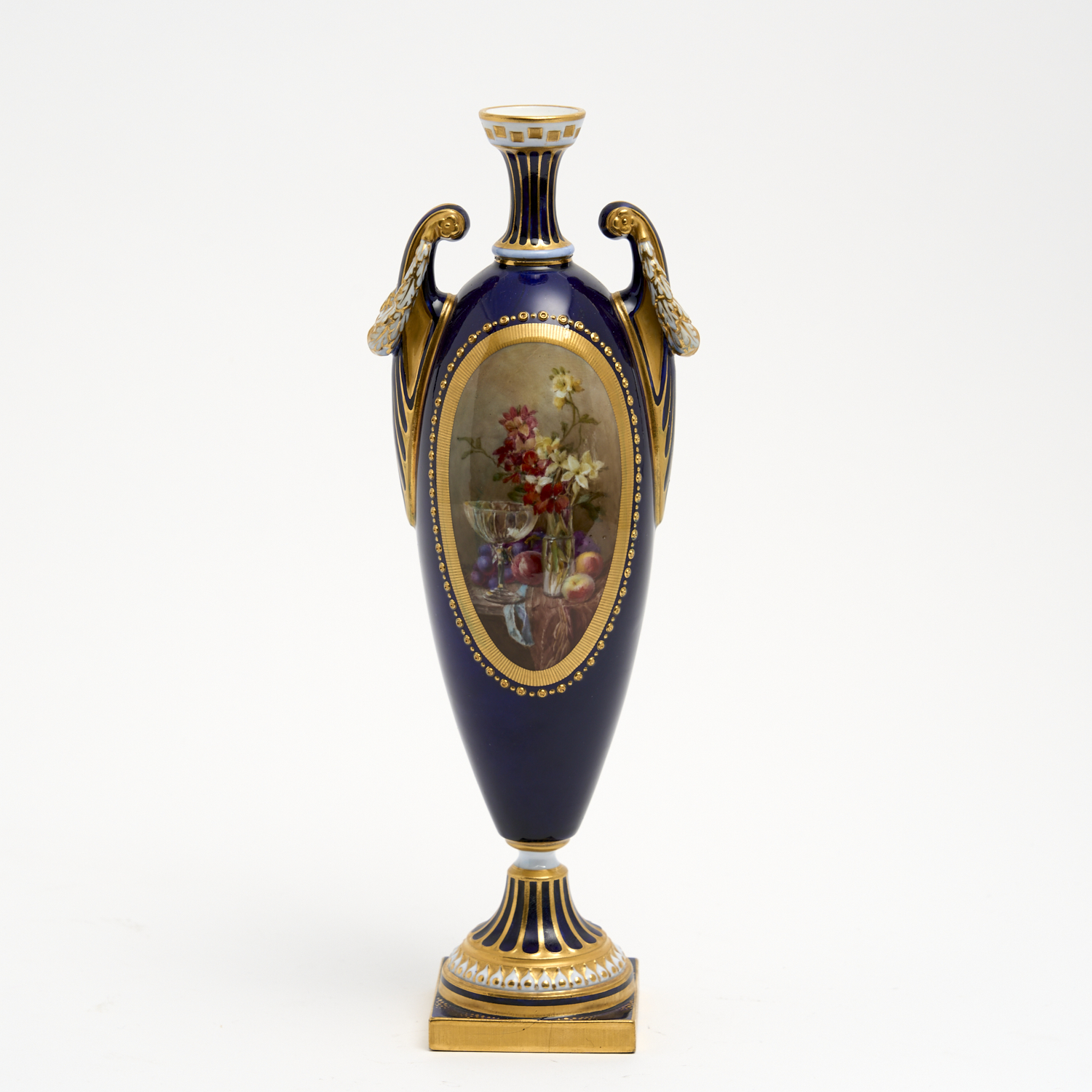Elongated ovoid in form with inverted scroll handles with garland loops, the body with a central reserve painted with a still life of fruit, flowers and glass vessels, signed Hawkins to lower left, puce factory mark underside, and numbered 2452