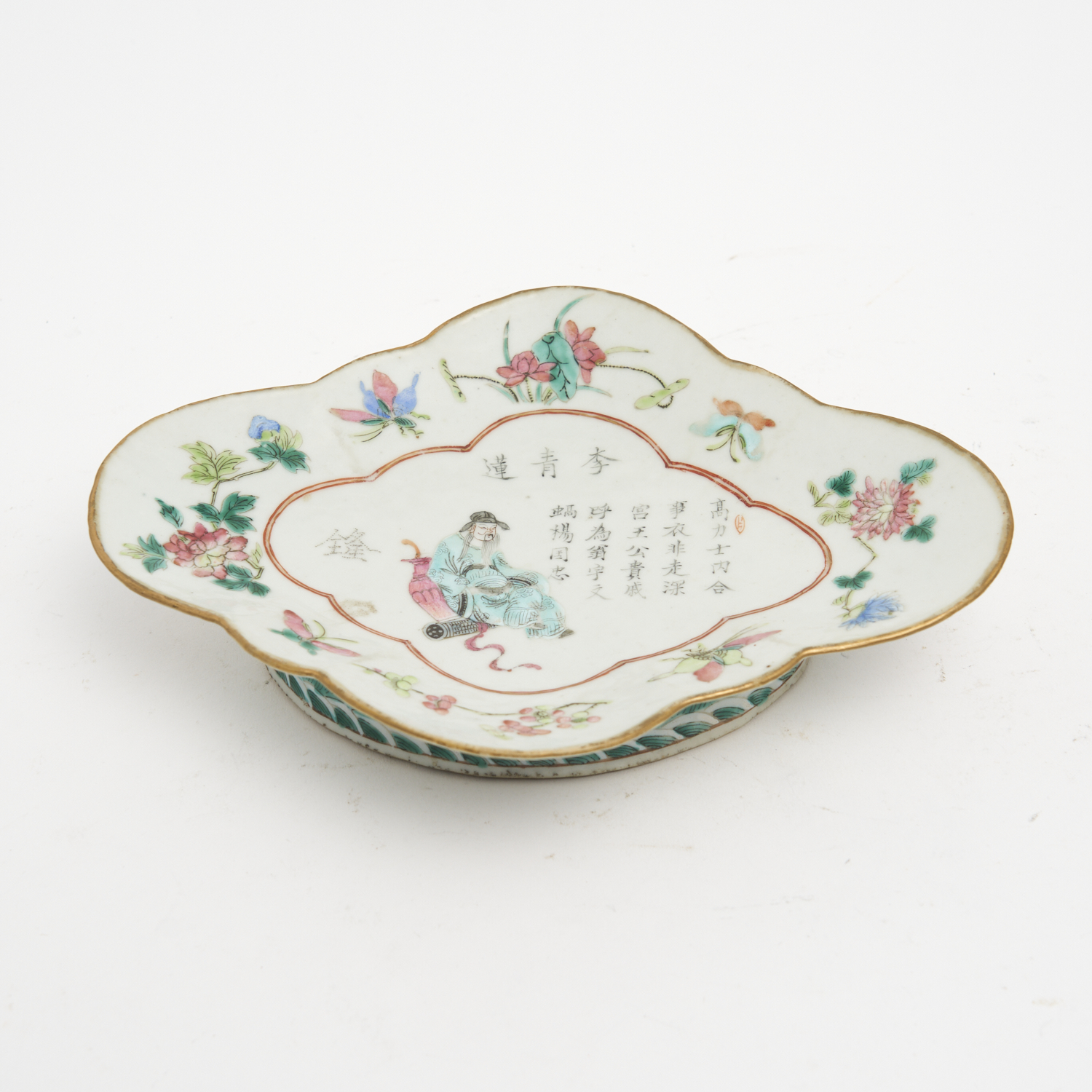 A 19TH CENTURY CHINESE FAMILLE ROSE SHALLOW LOZENG FORM DISH WITH POEM TO CENTRE L.24CM