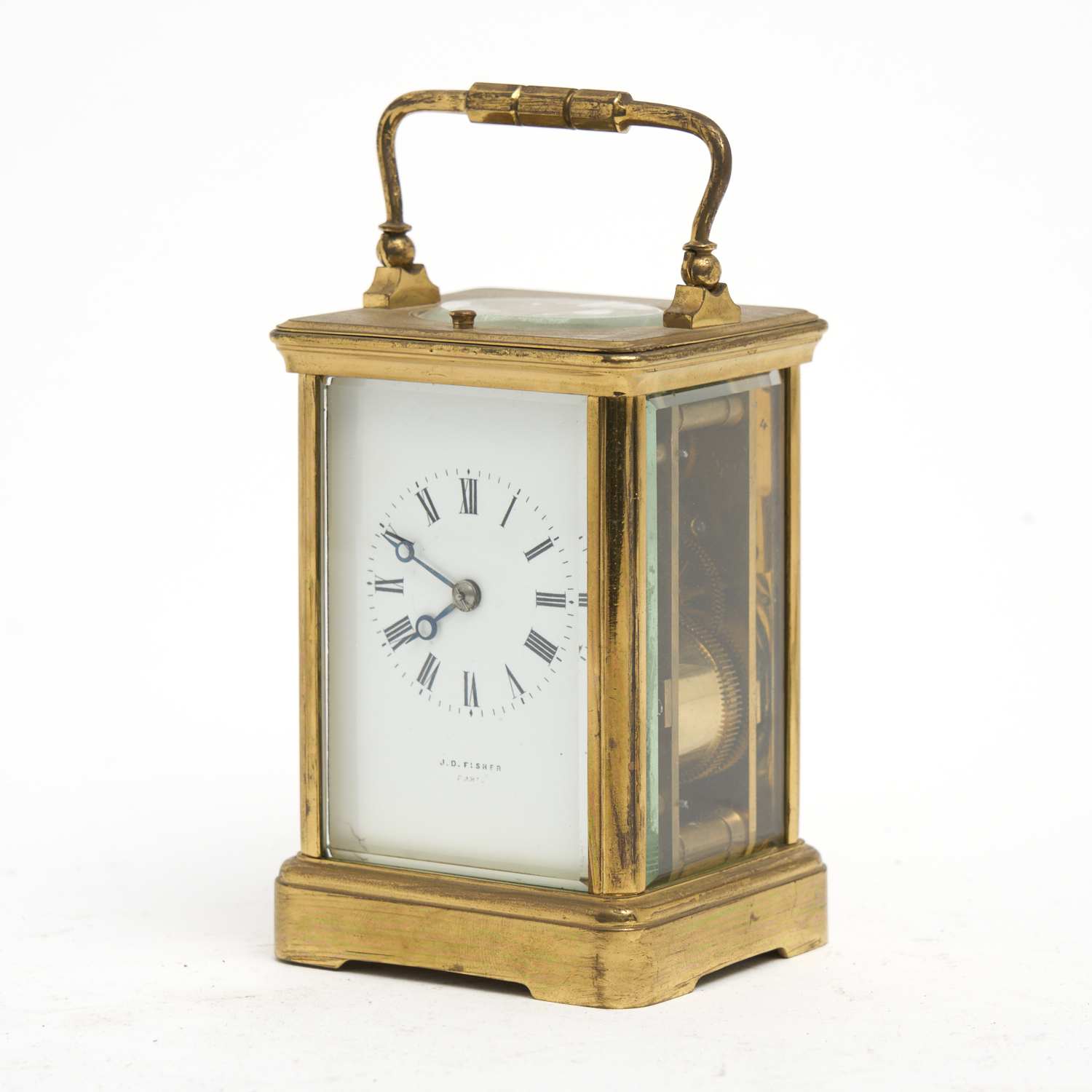 A REPEATING FRENCH BRASS CARRIAGE CLOCK BY J. D. FISHER (NO KEY) H.14CM