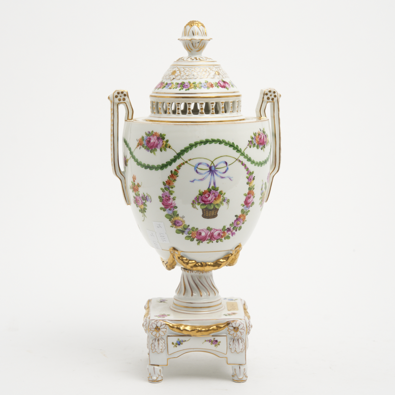 A LARGE DRESDEN LIDDED POT POURRI H.32.5CM