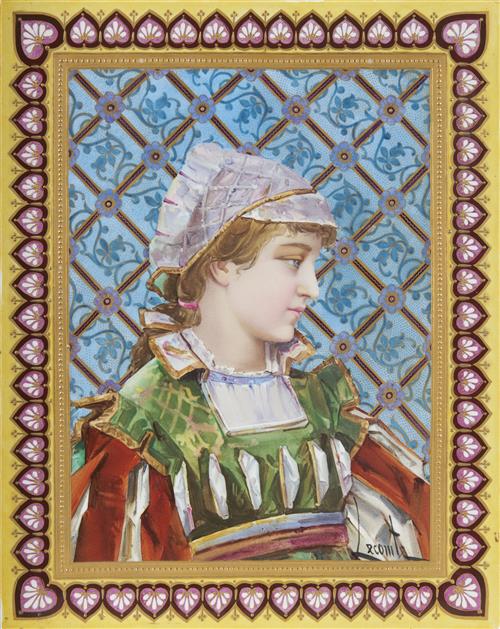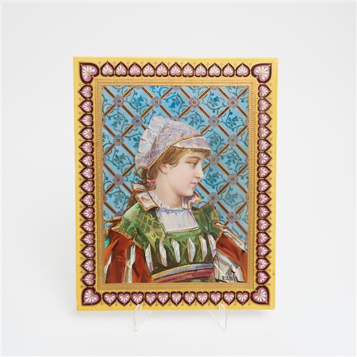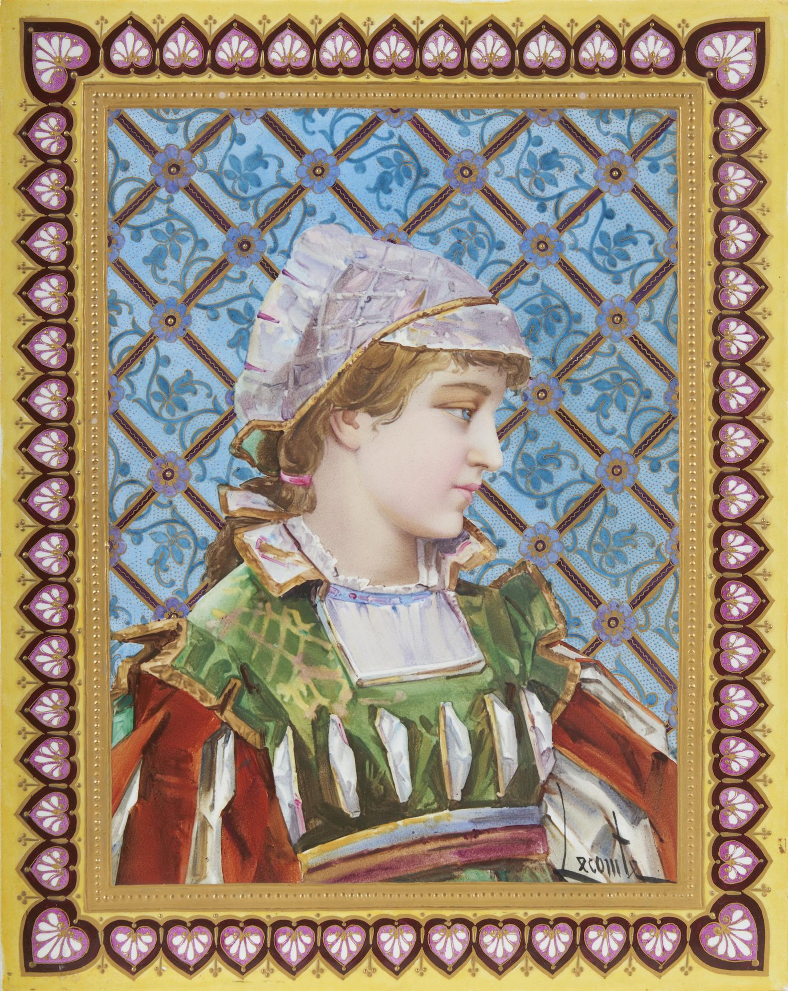 Rectangular, the field decorated with a bust-length portrait of a young woman in period dress on a geometric blue and gilt floral ground, signed 'Lecomte', within a gilt and yellow-ground border of anthemia, the remains of the original manuscript label to the reverse with the date 1883
