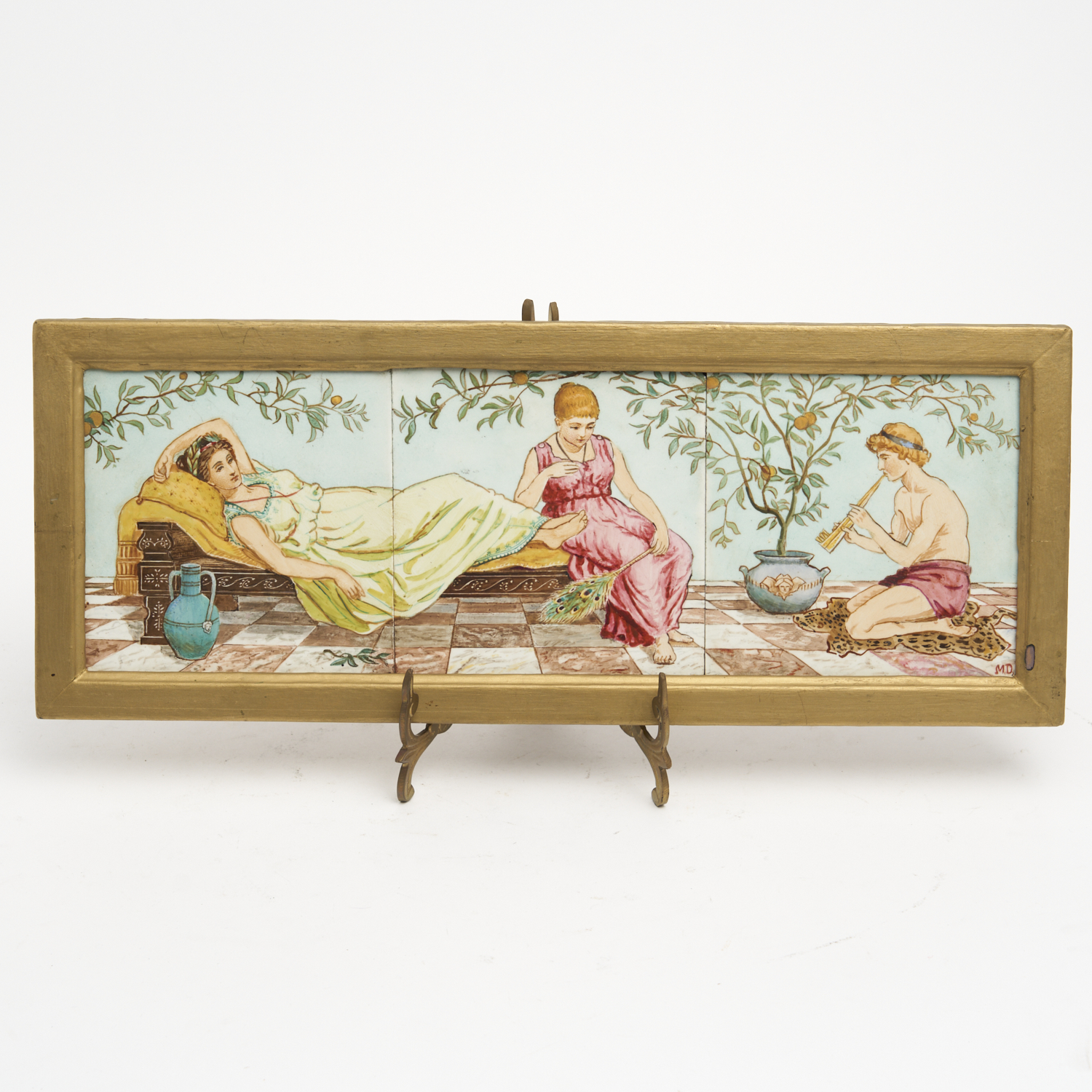 THREE FRAMED HANDPAINTED TILES, SIGNED 'M.D', EXHIBITED AT HOWELL AND JAMES POTTERY EXHIBITION PER LABEL VERSO L.50CM
