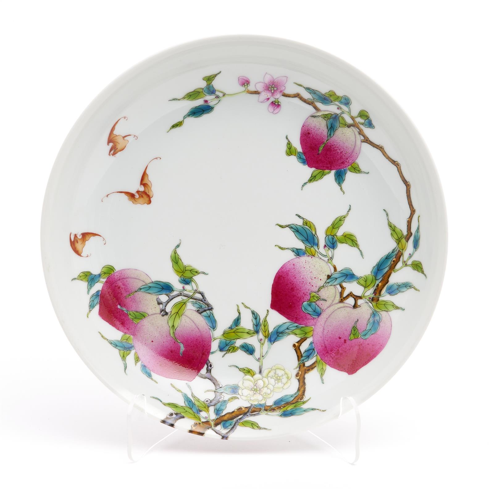 A 20TH CENTURY CHINESE FAMILLE ROSE DISH, QINGLONG MARK TO BASE, IN PRESENTATION BOX, DIA.23CM, LEONARD JOEL DELIVERY SIZE: MEDIUM