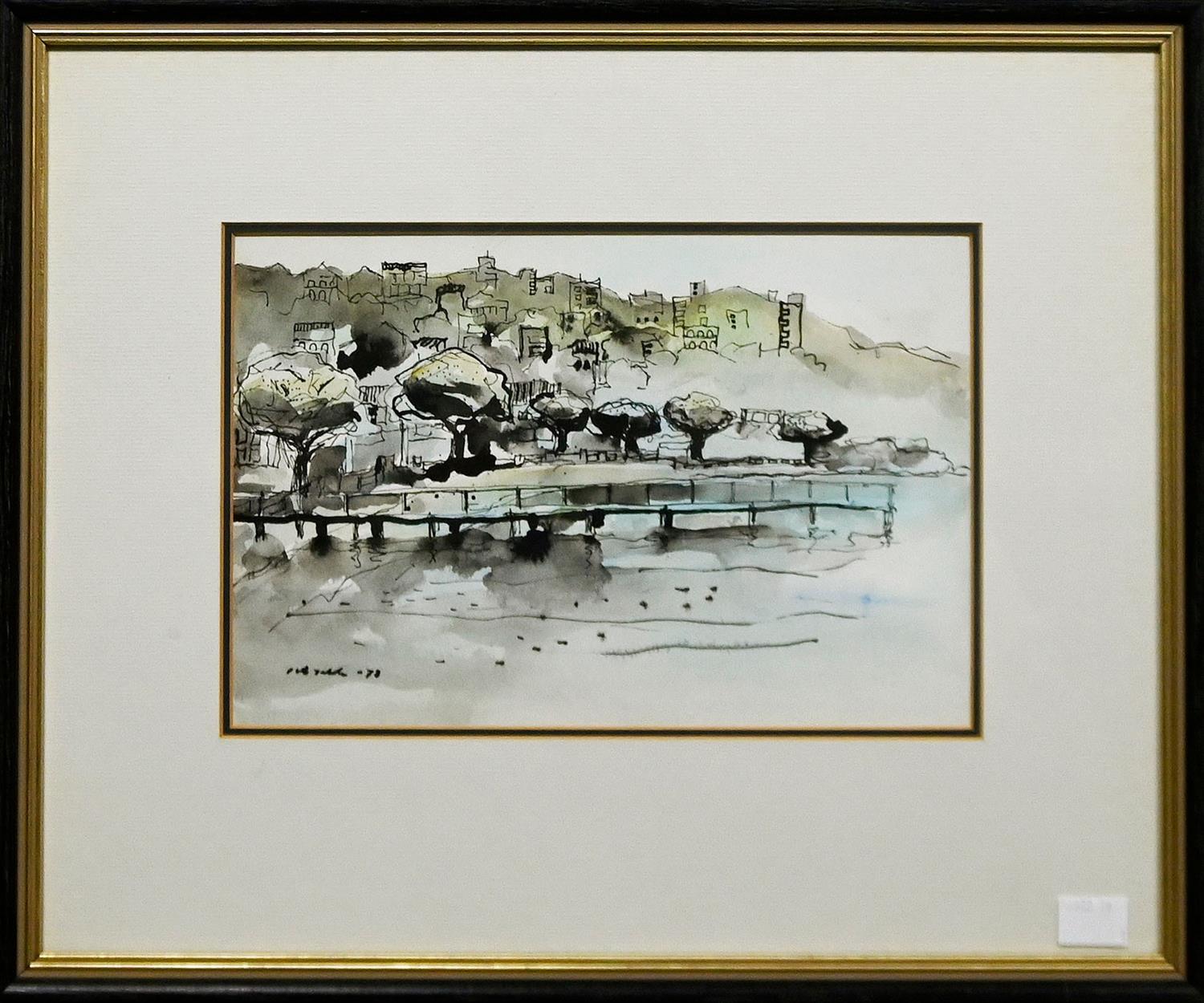 INK AND WASH, SIGNED INDECIPHERABLY AND DATED LOWER LEFT, 16.5 X 24CM, FRAME SIZE: 33.5 X 40.5CM