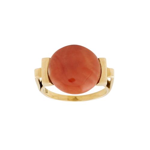 This elegant yellow gold Art Deco ring features a 14.3mm button shaped, polished bead of natural reddish-orange deep sea coral affixed to a base cup and supported by geometric stepped shoulders to a flat profile fine plain band, finger size N 1/2,