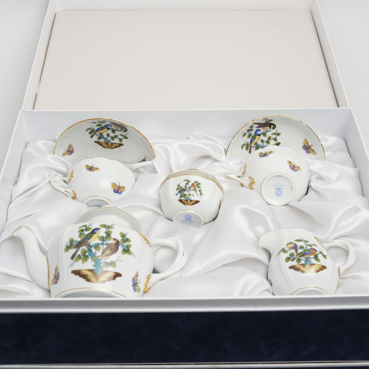 A HEREND ROTHCHILD PATTERN TEA SET COMPRISING TWO TEA CUPS AND SAUCERS, A TEAPOT, SUGAR BOWL AND CREAMER TOGETHER WITH A TRAY, COMES IN ORIGINAL PRESENTATION BOX L.49.5CM, LEONARD JOEL DELIVERY SIZE: LARGE
