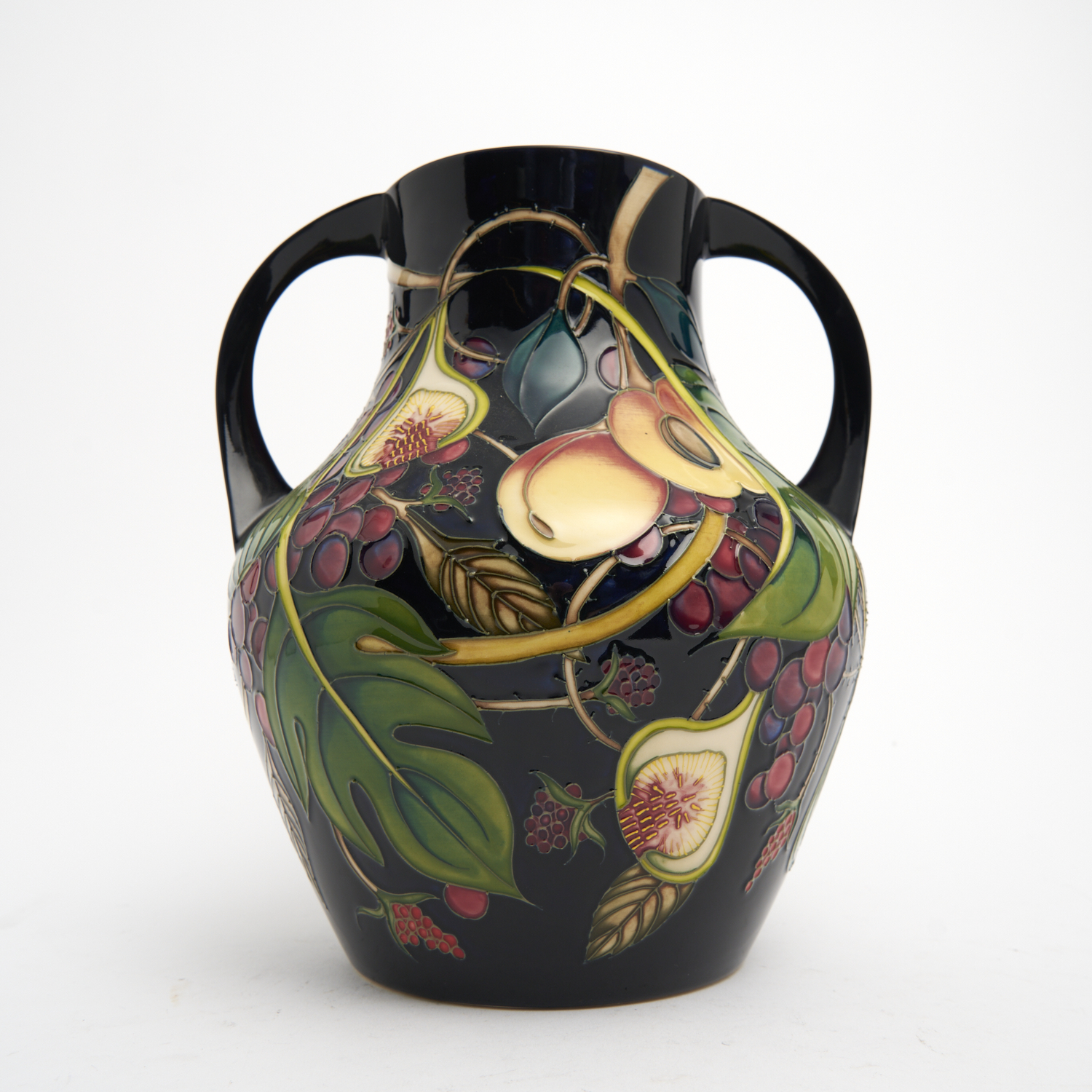 A LARGE MOORCROFT QUEENS CHOICE FIG AND PEACH VASE BY EMMA BOSSONS, SIGNED TO BASE BY HUGH EDWARDS IN ORIGINAL BOX H.260CM