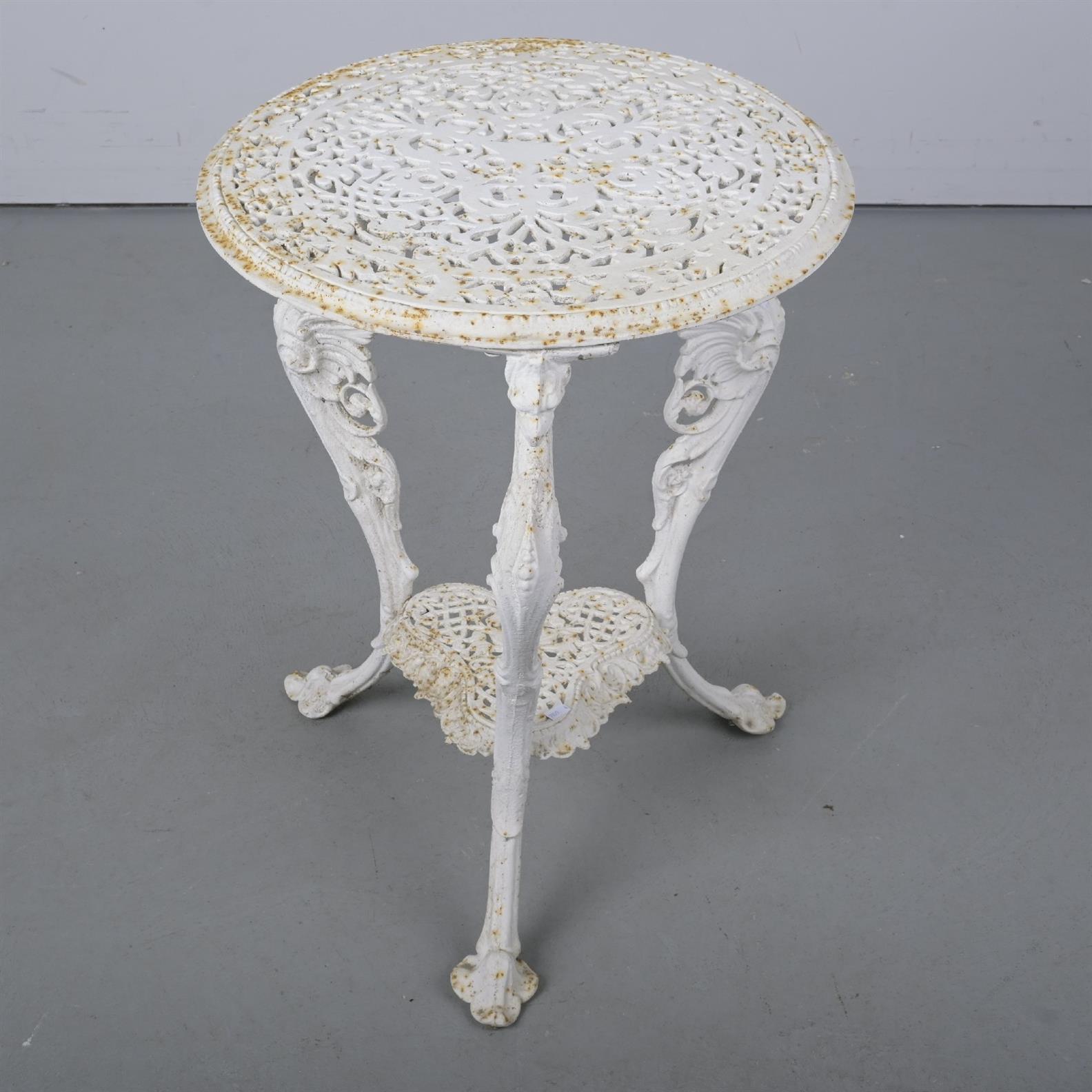 A CAST IRON OUTDOOR TABLE ON FIGURAL BASE (67H X 50DIA CM)