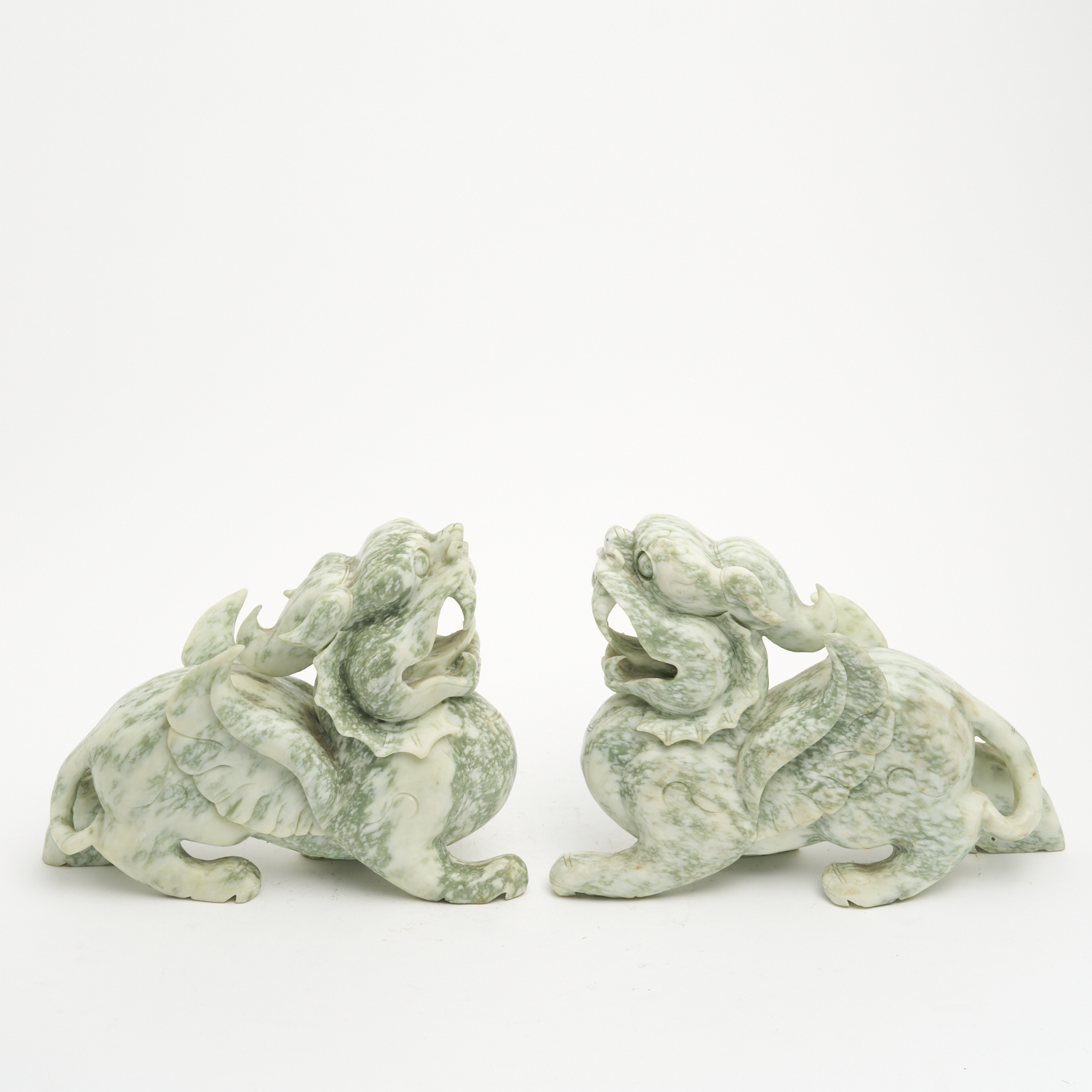 A PAIR OF GREEN STONE FOO DOGS W.33CM