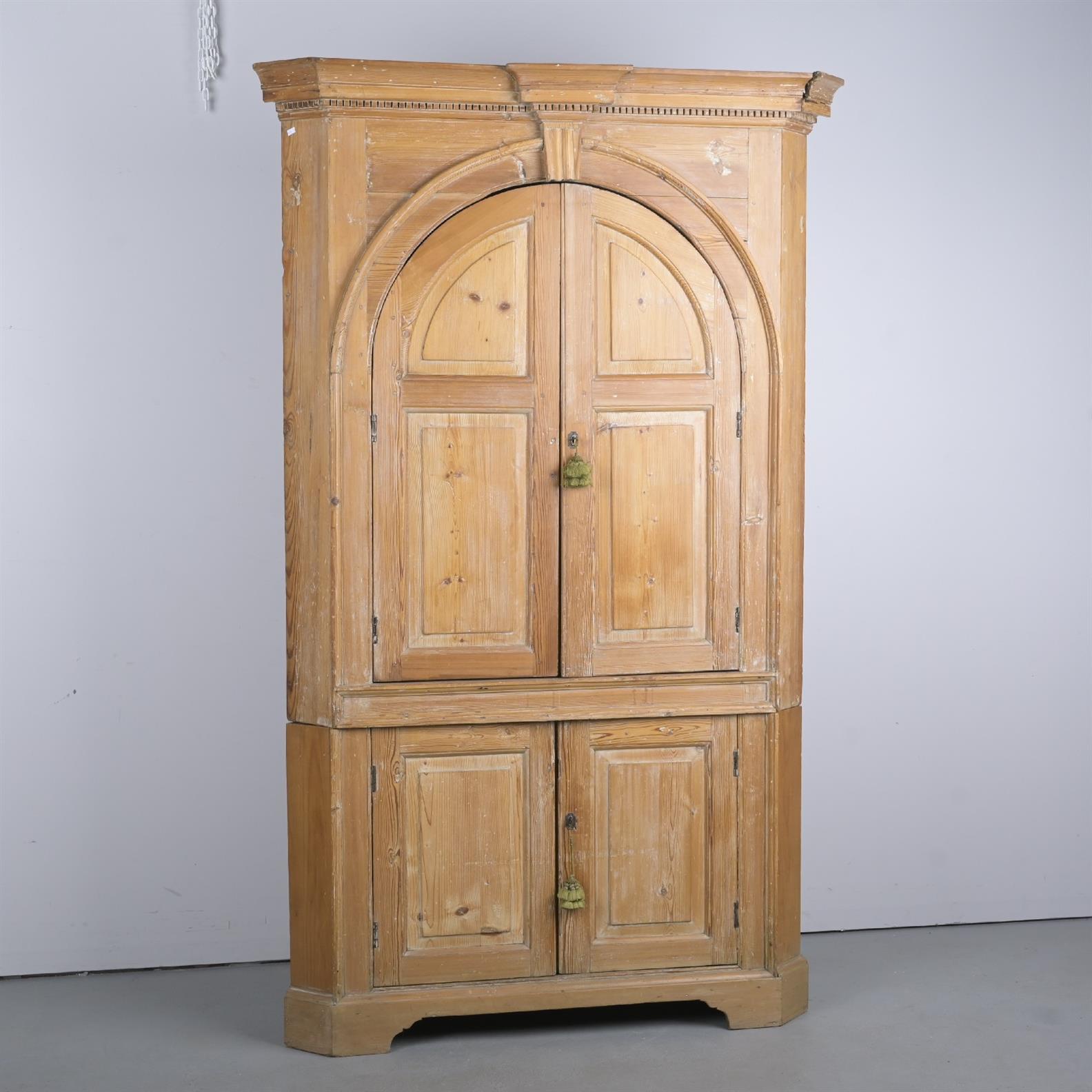 AN EIGHTEENTH CENTURY GEORGIAN PINE CORNER CUPBOARD (A/F) (217H X 135W X 92D CM) (THIS ITEM MUST BE REMOVED BY CARRIERS AT THE CUSTOMER'S EXPENSE. LEONARD JOEL STAFF CANNOT ASSIST CARRYING THIS ITEM.)