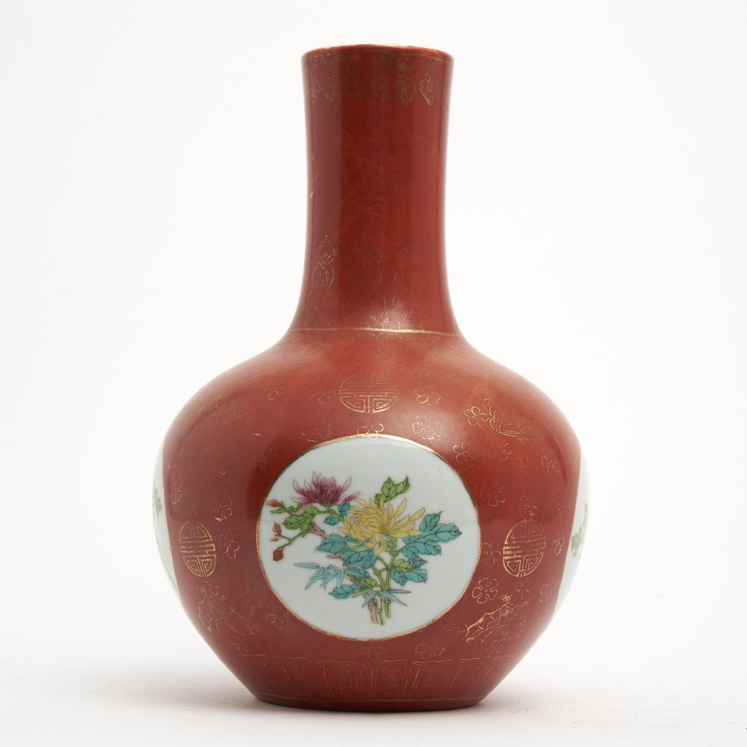 A LARGE CHINESE REPUBLIC PERIOD RED CORAL GLAZED AND GILDED VASE H.33CM