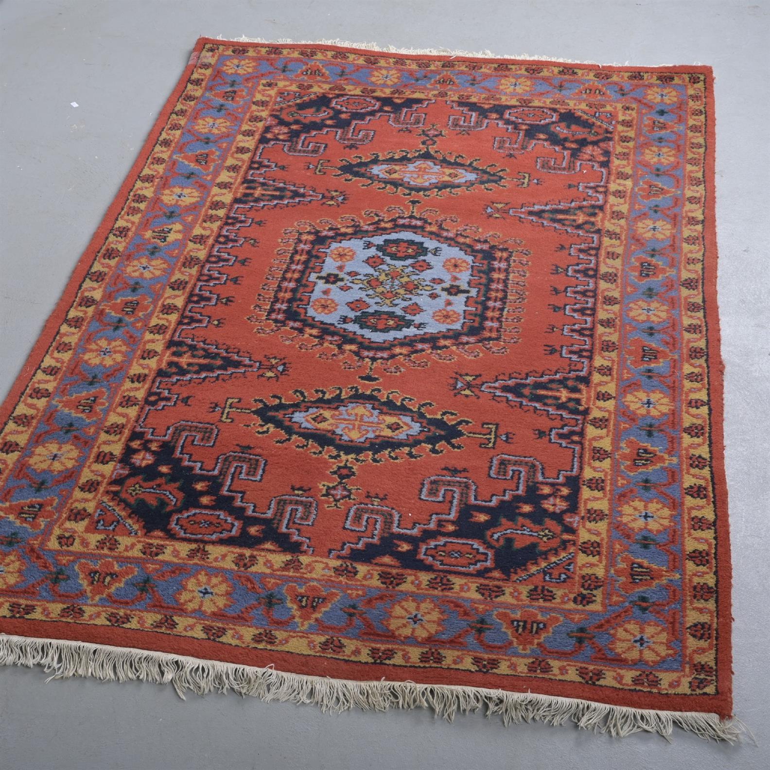 AN INDIAN WOOL RUG, HANDKNOTTED, WITH TRIPLE MEDALLION IN A RED FIELD (195 X 130 CM) (PLEASE NOTE THERE MAY BE SOME COLOUR VARIATION FROM PHOTOGRAPH)