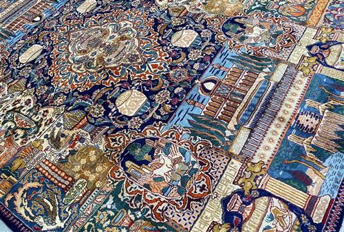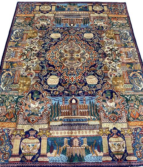 A PERSIAN ARCHAEOLOGY DESIGN KASHMAR WOOL RUG. HAND-KNOTTED CITY WEAVE FROM THE KHORASAN PROVINCE WITH TRADITIONAL DESIGN OF CENTRAL MEDALLION CONTAINING, EXCAVATED URNS AND MYSTICAL SIMORGH BIRDS, SET AGAINST PANELS CONTAINING HISTORICAL MONUMENTS, EXCAVATED URNS, AMPHORAS, COUNTRY SCENES AND SIMORGH BIRDS. THE ENTIRE IN SHADES OF INDIGO, CREAM, BLUE AND CARAMEL. EX-GALLERY DISPLAYED IN EXCELLENT CONDITION. CERTIFICATE OF AUTHENTICITY AND ORIGIN ON REQUEST. ORIGIN: IRAN (335 X 250 CM) (PLEASE NOTE THERE MAY BE SOME COLOUR VARIATION FROM PHOTOGRAPH)