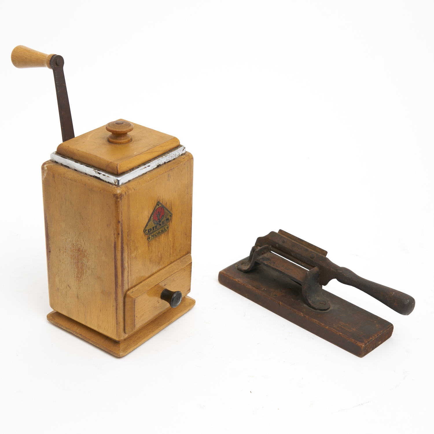 A DIENES MOKKA COFFEE GRINDER TOGETHER TOGETHER WITH A TOBACCO CUTTER H.22CM