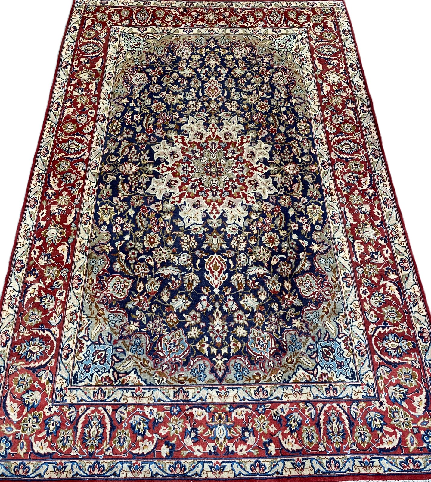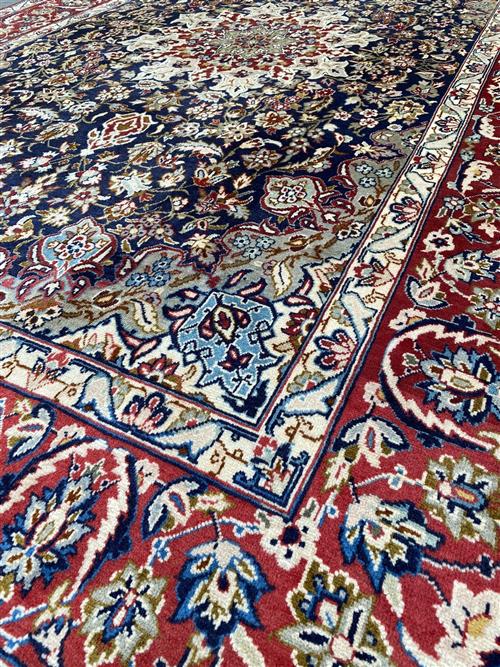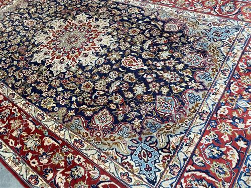 A PERSIAN ISFAHAN WOOL RUG. HANDKNOTTED UNIQUE FLORAL DESIGN OF SUNBURST MEDALLION OF PALMETTES AND QUARTERED CORNER MEDALLIONS WITHIN AN INDIGO FIELD OF SHAH ABBASSI PALMETTES, FLOWER HEADS AND SAZ LEAVES. IN SHADES OF CORNFLOWER BLUE, CREAM AND RED. BORDER OF PALMETTES, FLORAL MOTIFS TENDRILS. GALLERY EXHIBITED. IN PRISTINE CONDITION. CERTIFICATE OF AUTHENTICITY AND ORIGIN ON REQUEST. ORIGIN: IRAN (320 X 205 CM) (PLEASE NOTE THERE MAY BE SOME COLOUR VARIATION FROM PHOTOGRAPH)