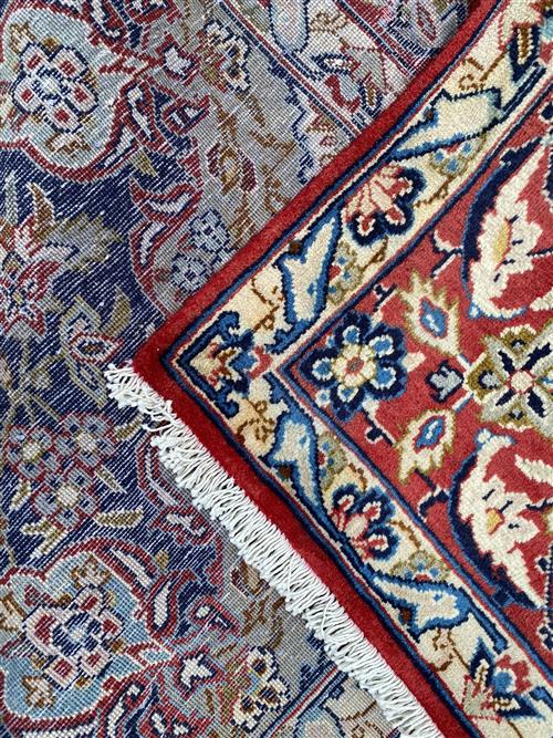 A PERSIAN KASHAN WOOL RUG. HAND-KNOTTED WITH A CLASSIC FLORAL DESIGN OF BOLD SUNBURST MEDALLION OF PALMETTES AND QUARTERED CORNER ME...