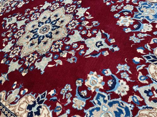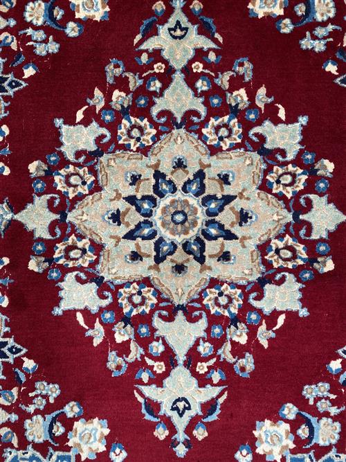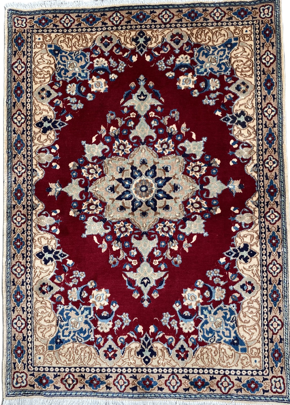 A PERSIAN NAIEN WOOL AND SILK RUG. APPROXIMATELY 400,000 INDIVIDUAL KNOTS PER SQUARE METER. HAND-KNOTTED CLASSIC NAIEN DESIGN OF DOMINANT FLORAL MEDALLION AND QUARTERED CORNER MEDALLIONS IN CREAM, CARAMEL, INDIGO AND BABY BLUE, SET WITHIN AN OPEN CRIMSON FIELD. BORDER OF ROSETTES. ORIGIN: IRAN (128 X 90 CM) (PLEASE NOTE THERE MAY BE SOME COLOUR VARIATION FROM PHOTOGRAPH)