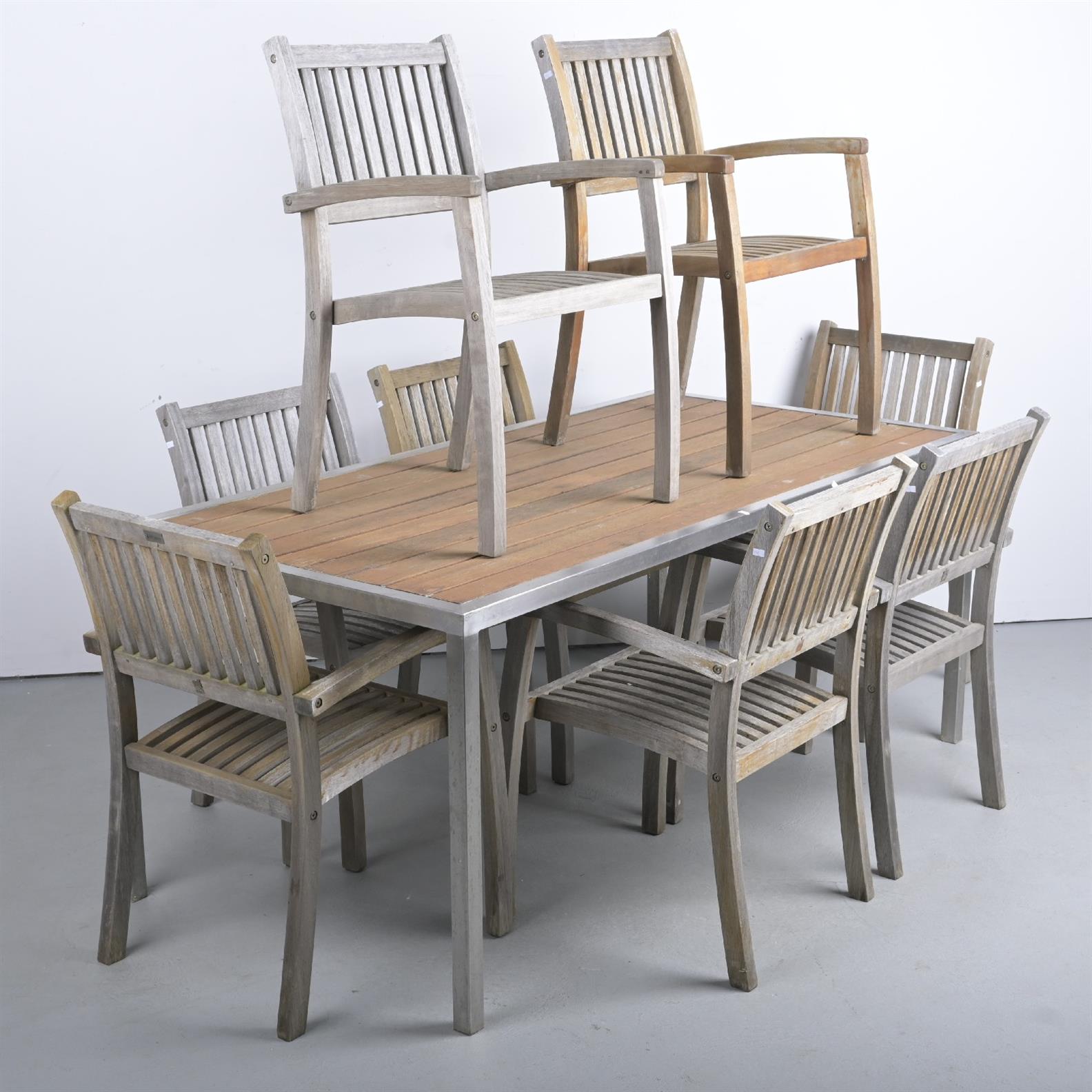 A NINE PIECE TEAK OUTDOOR SETTING INCLUDING TABLE WITH STEEL FRAME (A/F) (75H X 180W X 90D CM) (THIS ITEM MUST BE REMOVED BY CARRIERS AT THE CUSTOMER'S EXPENSE. LEONARD JOEL STAFF CANNOT ASSIST CARRYING THIS ITEM.)