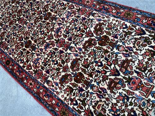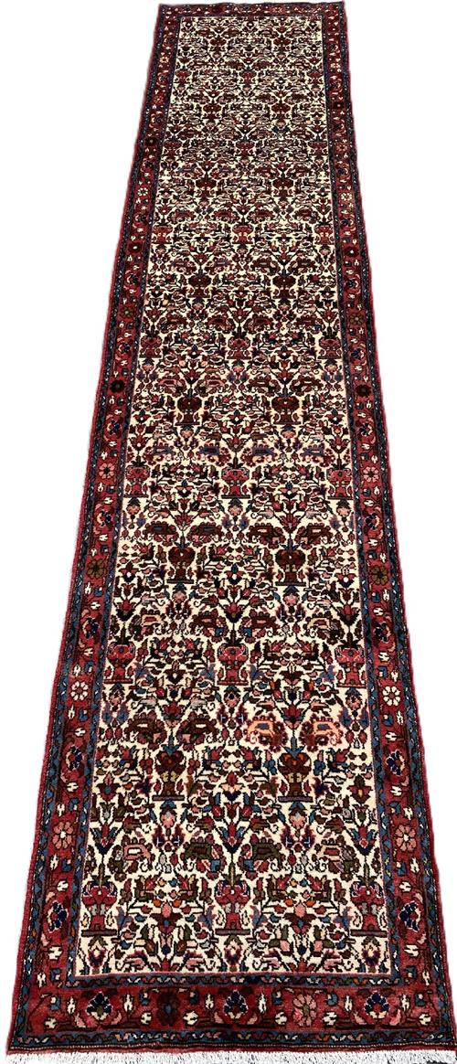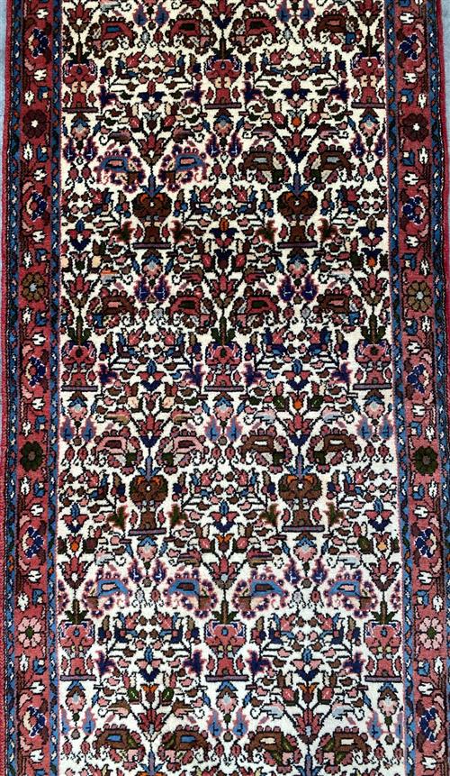 A NEW UNUSUAL PERSIAN RUDBAR WOOL HALL RUNNER. HAND-KNOTTED IN THE NORTHERN REGION OF PERSIA. PICTORIAL DESIGN OF REPEATING GARDEN URNS BEARING INTRICATE FLORAL FOLIAGE AND PAISLEY MOTIFS. BORDER OF FLOWER HEADS TENDRILS. IN EXCELLENT CONDITION. CERTIFICATE OF AUTHENTICITY AND ORIGIN ON REQUEST. ORIGIN: IRAN (383 X 77 CM) (PLEASE NOTE THERE MAY BE SOME COLOUR VARIATION FROM PHOTOGRAPH)