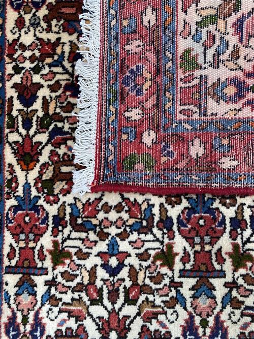 A PERSIAN ISFAHAN WOOL RUG. HANDKNOTTED UNIQUE FLORAL DESIGN OF SUNBURST MEDALLION OF PALMETTES AND QUARTERED CORNER MEDALLIONS WITH...