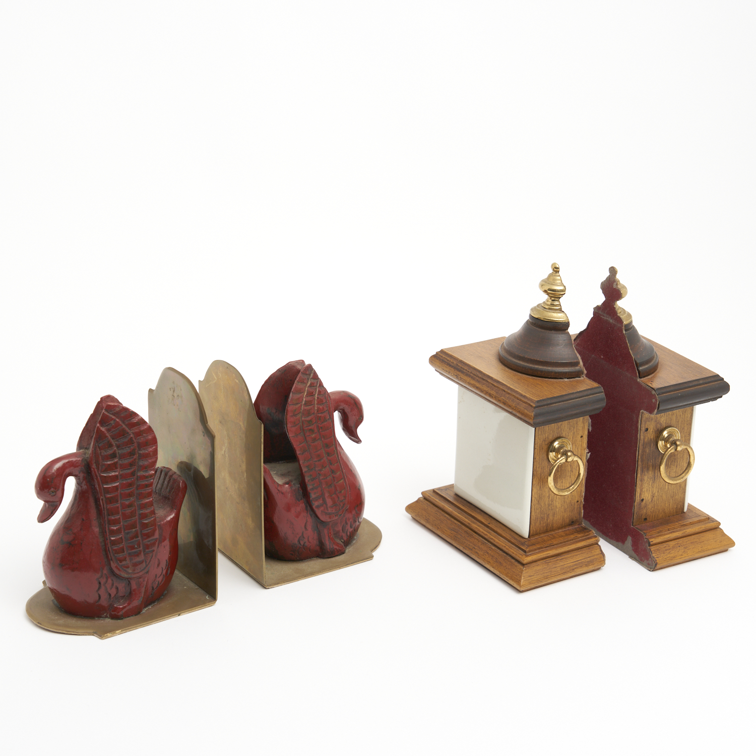 A PAIR OF METAL AND TIMBER SWAN FORM BOOKENDS TOGETHER WITH A PAIR OF ITALIAN PEDESTAL FORM BOOKENDS H.23CM (TALLEST)