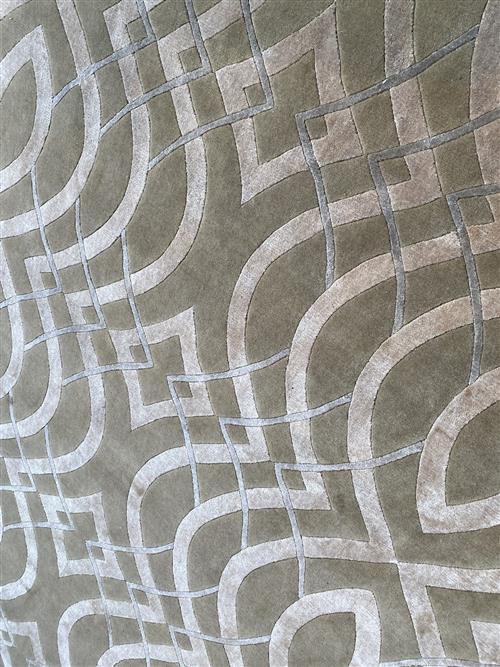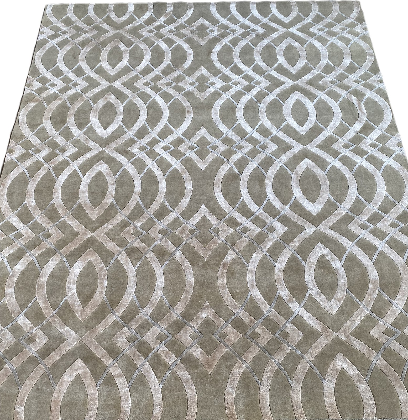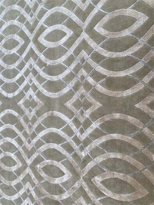 A NEW EX- GALLERY CONTEMPORARY IMPERIAL COLLECTION DESIGNER RUG. HAND KNOTTED WITH NZ WOOL WITH TENCEL SILK HIGHLIGHTS AND UNIQUELY HAND CARVED EMBOSSED PATTERNS. THE ENTIRE IN TONES OF BEIGE, CREAM AND SILVERY GREY. IN EXCELLENT CONDITION. CERTIFICATE OF AUTHENTICITY AND ORIGIN ON REQUEST. ORIGIN: RAJASTHAN (305 X 247 CM) (PLEASE NOTE THERE MAY BE SOME COLOUR VARIATION FROM PHOTOGRAPH)