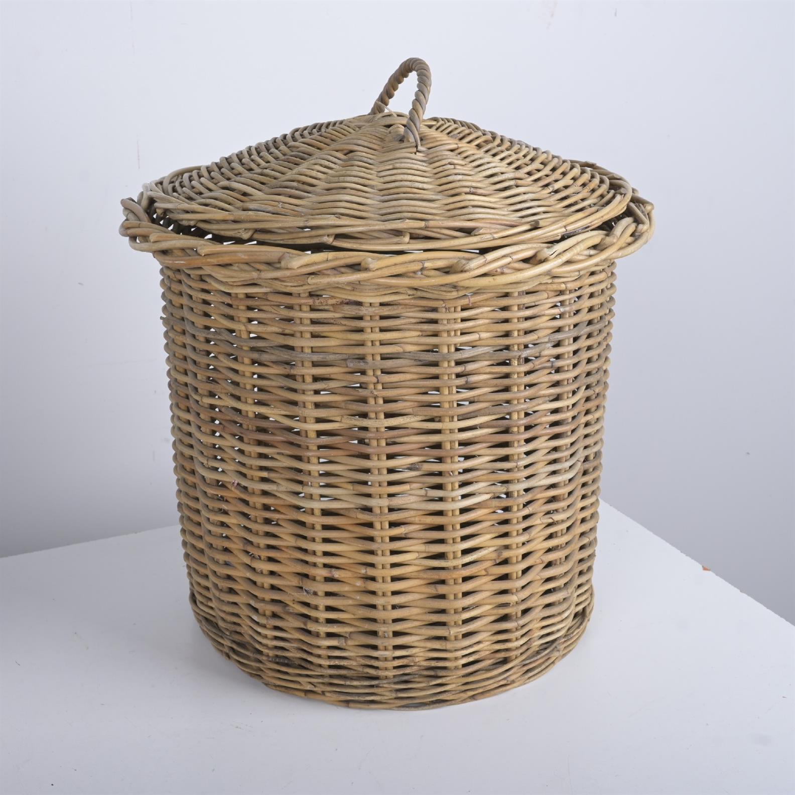 AN OLD FRENCH CANE BASKET WITH LID (55H X 49DIA CM)
