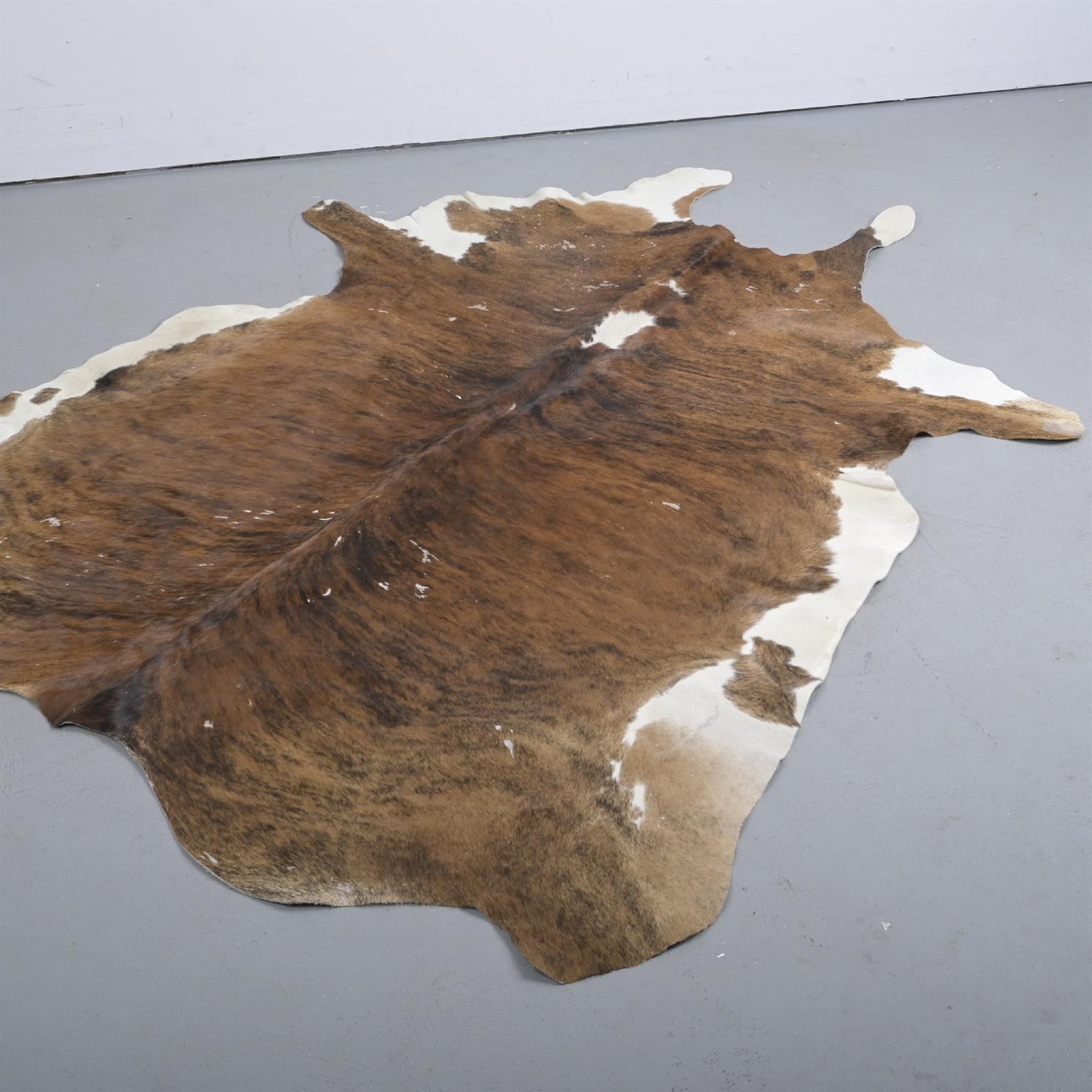 A BROWN AND WHITE COW HIDE RUG (A/F) (210 X 180 CM) (PLEASE NOTE THERE MAY BE SOME COLOUR VARIATION FROM PHOTOGRAPH)