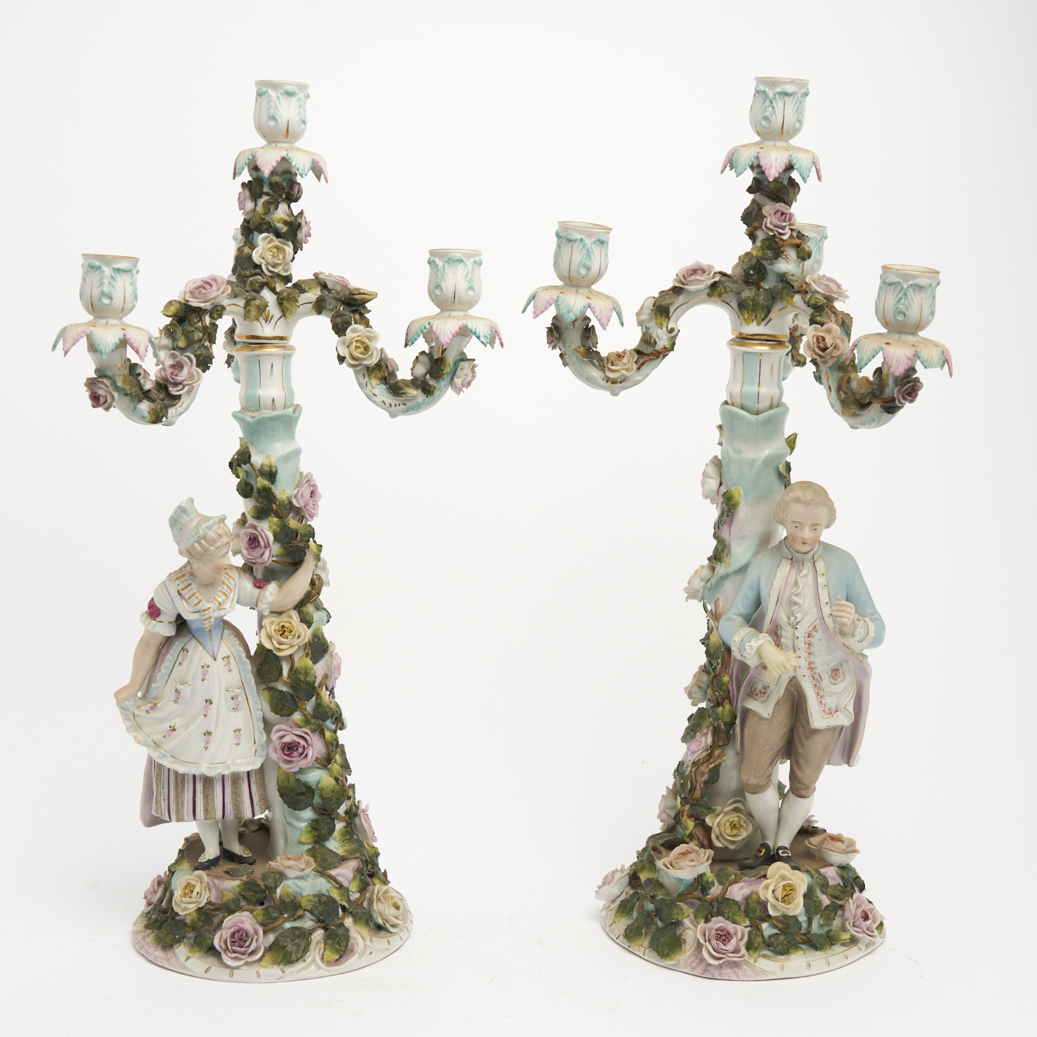 A PAIR OF SITZENDORF PORCELAIN CANDELABRA (A/F) H.54CM