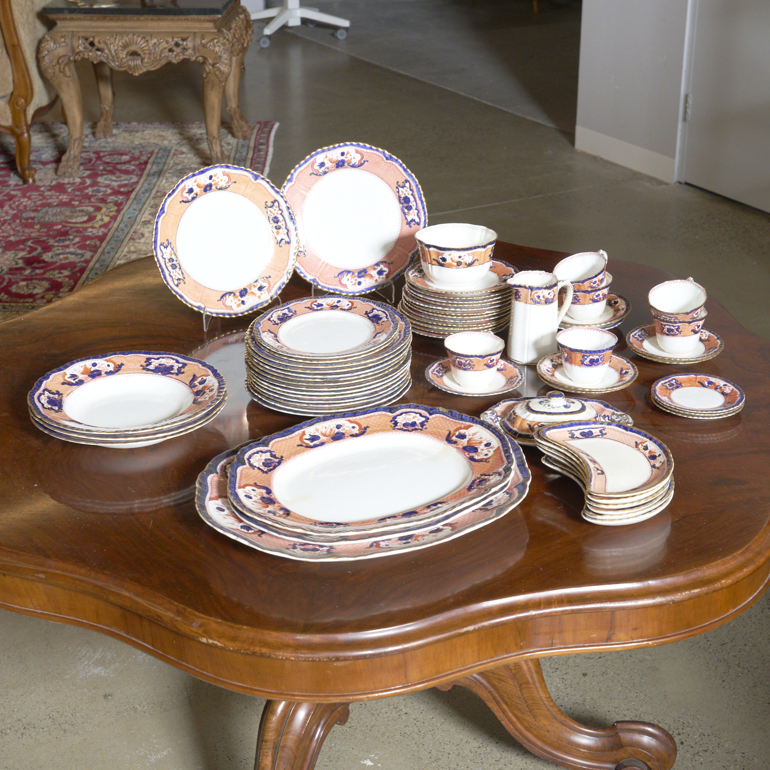 A COMPREHENSIVE SET OF BOOTH'S 'VICTORIA' PATTERN DINNERWARE COMPRISING ASSORTED PLATTERS, PLATES, BOWLS, AND TEACUPS (A/F) L.41CM (LARGEST PLATTER)