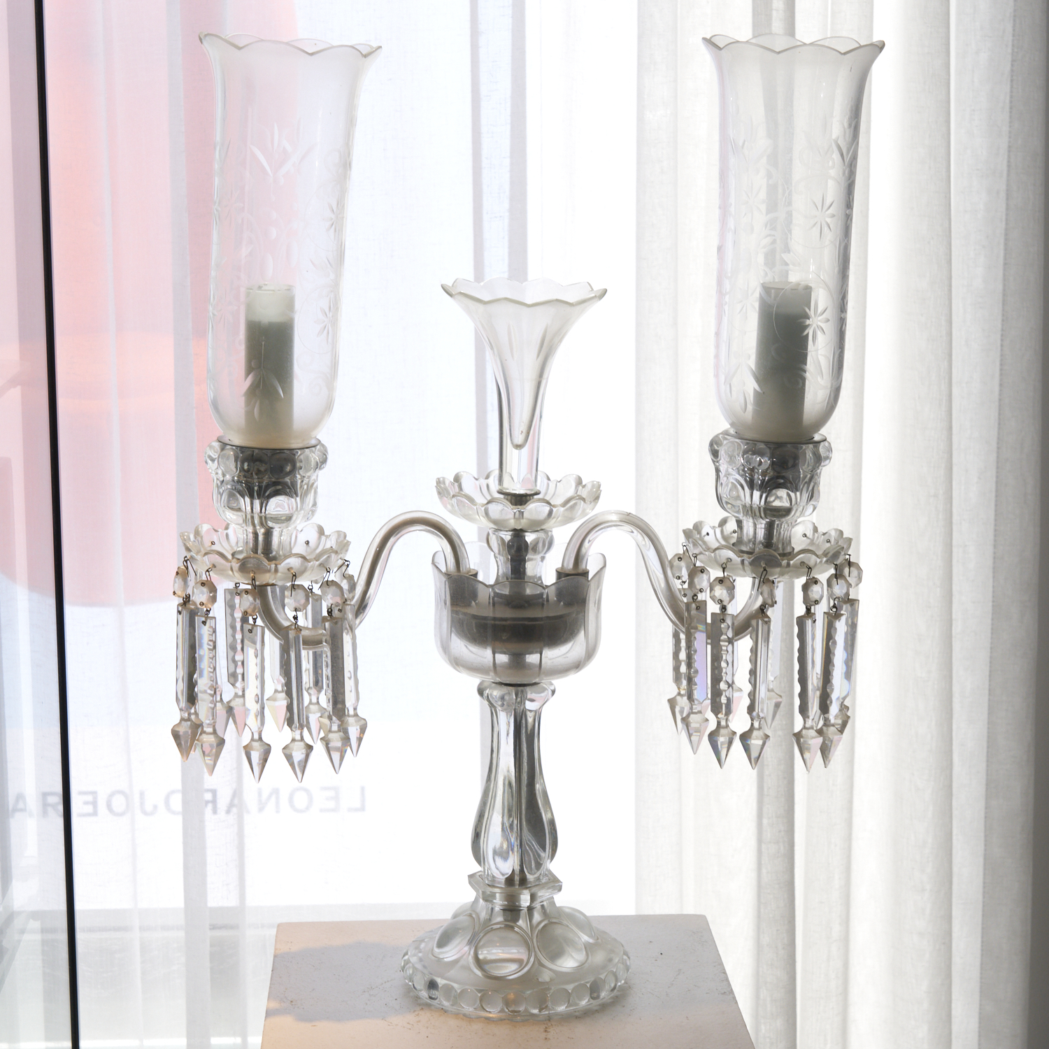 A PRESSED GLASS AND CRYSTAL TWIN BRANCH CANDELABRA WITH ETCHED STORM SHADES H.61CM